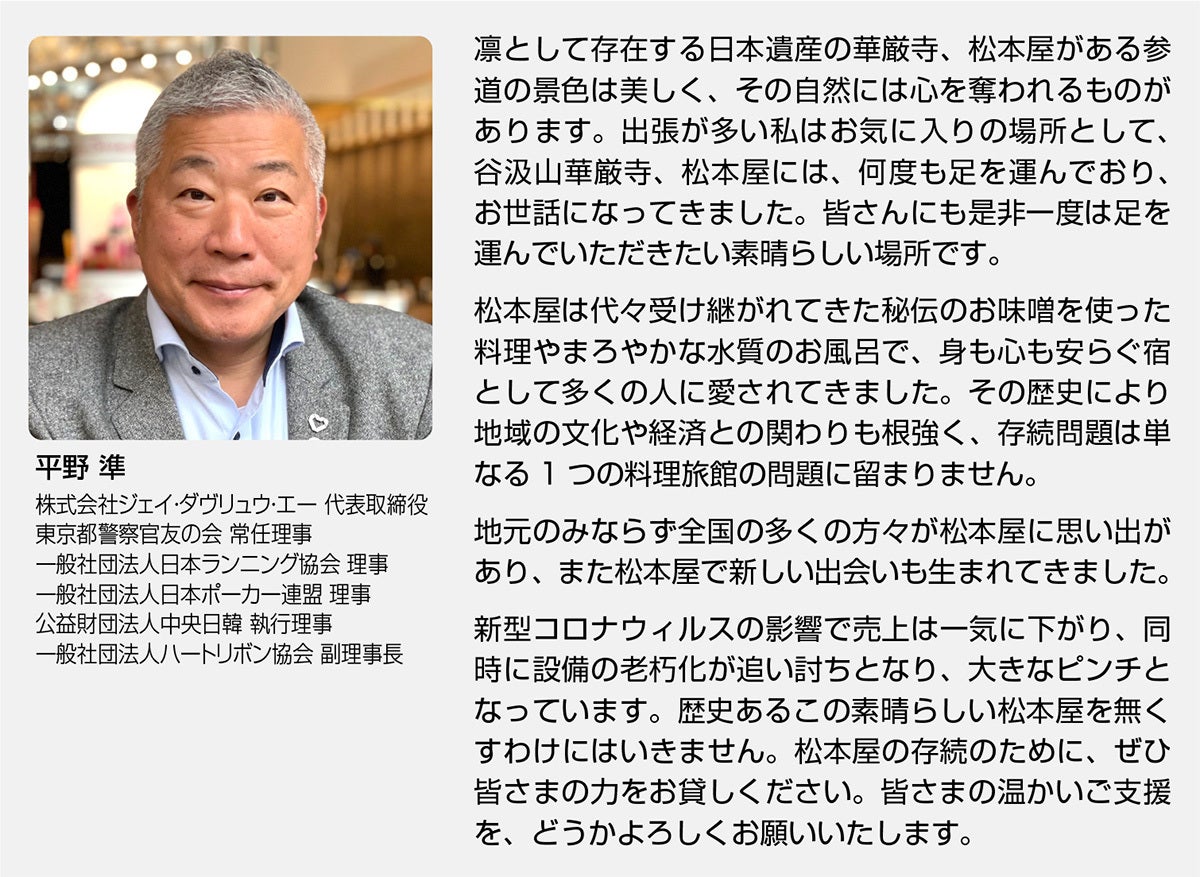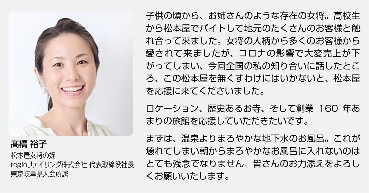 ここで廃業してしまえば、1300年の歴史がある谷汲山華厳寺の宿坊であり、参道を彩る料理旅館がなくなってしまいます。「松本屋」には、皆様の思い出の場所が詰まった150年の歴史があります。その思いと歴史を守るべく、老朽化した設備を修復して、皆さんに安心してご利用いただき、喜んでいただけるサービスを提供したいと思います。今回、修繕することができれば、安定した宿泊客や宴会客が望めます。どうぞ、ご支援ご協力をお願い申し上げます。