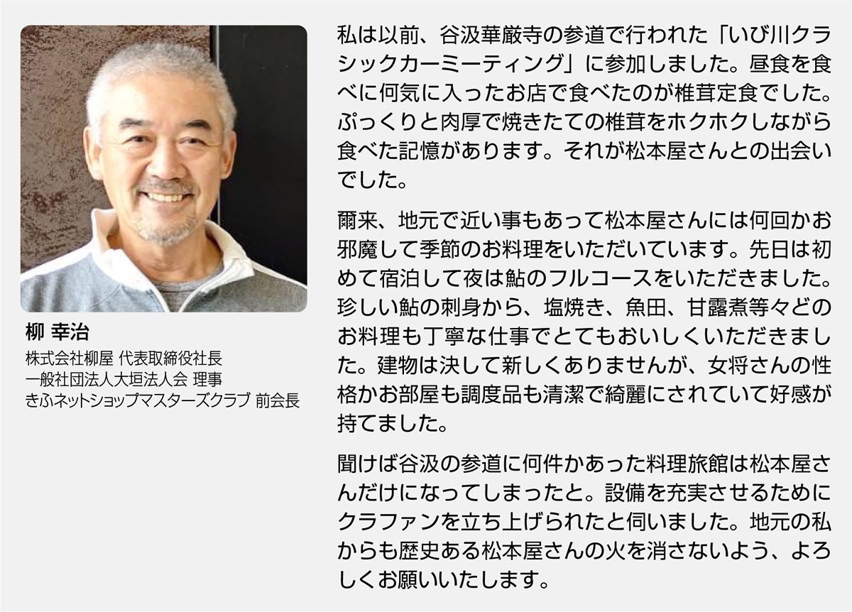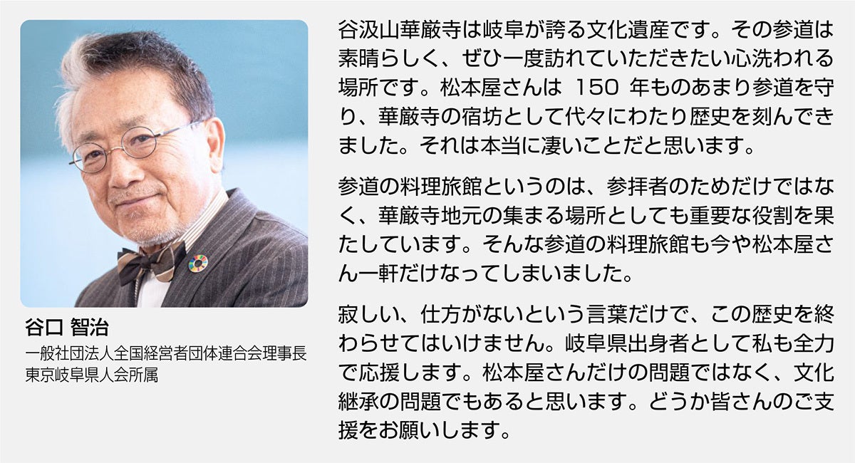 新型コロナの影響とはいえ、努力が足りなかったと反省することも大いにありました。あらゆる手を尽くしたものの修繕費までは捻出できず諦めかけましたが、多くの皆様のからの励ましの声が届き「絶対に存続さなければならない」と強い決意を持ちました。そこでクラウドファンディングを立ち上げ、皆様からのご支援に望みを託すことにしました。「松本屋」はもちろん谷汲山華厳寺を知っていただけるきっかけにもなればと思います。参道唯一の料理旅館の歴史を守り、素晴らしい宿として皆様に喜んでいただけますよう誠心誠意努めて参ります。どうかご支援いただきますよう、よろしくお願い申し上げます。