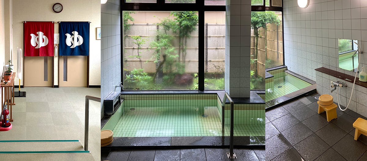 名物のお風呂は、地下水を汲み上げたまろやかな水質のお湯が特徴です。湯船からは落ち着いた庭が見えて、ゆっくりと過ごしていただけます。多くの参拝者も、このお風呂で疲れを取り心を癒してきました。