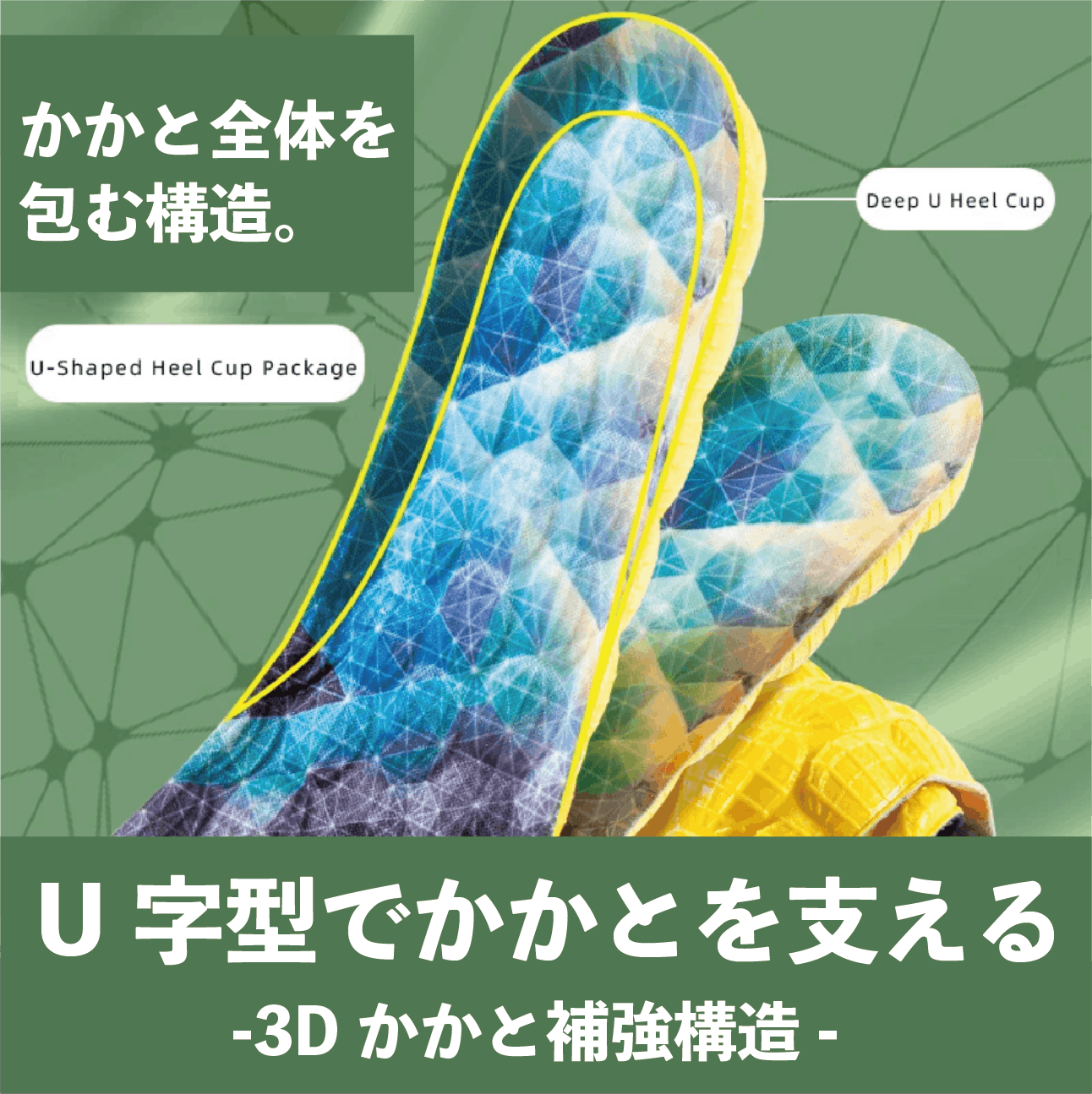 衝撃分散力に優れたクッションそして、U字構造がかかとを包み込み、足の側面からもバランスをサポート!