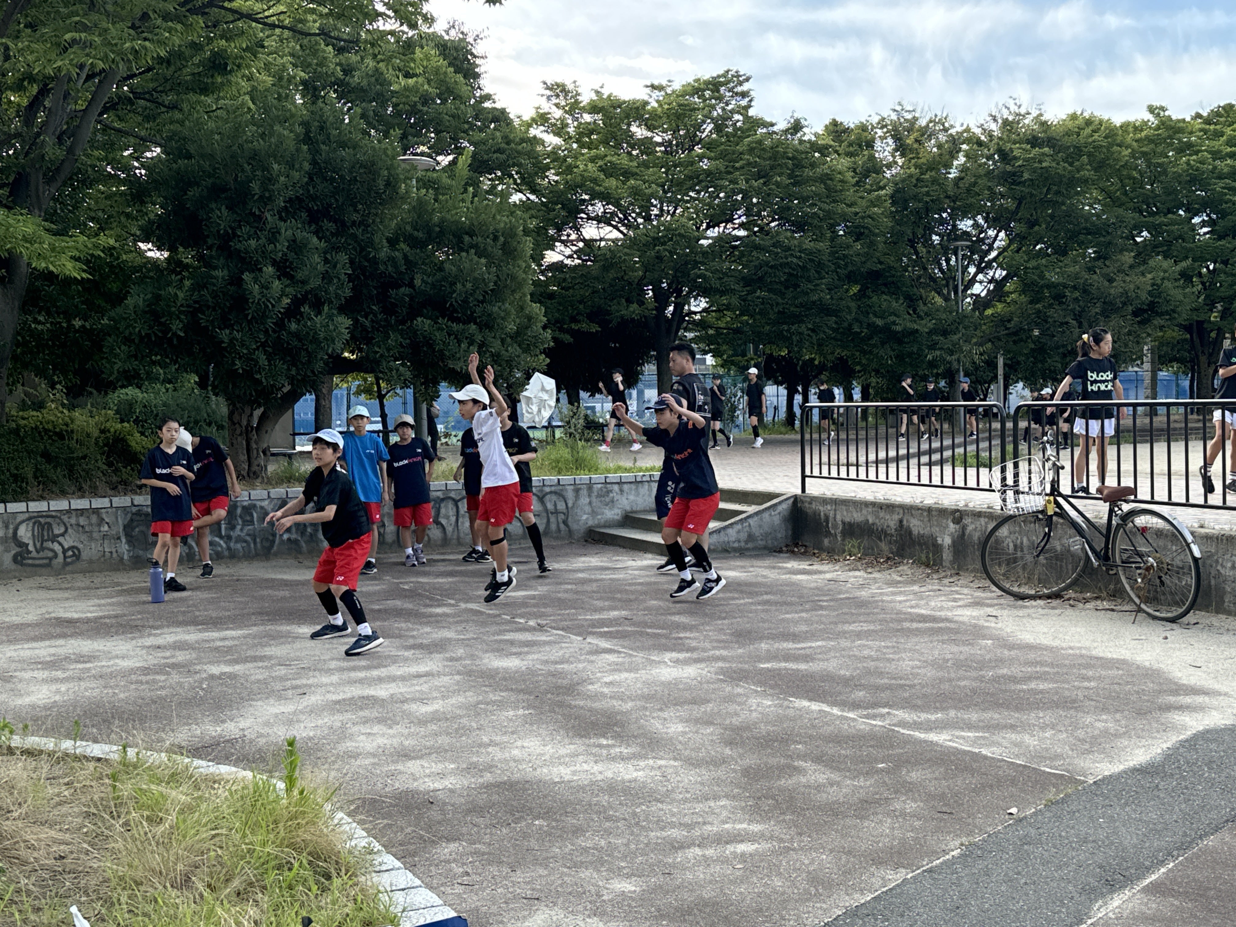 朝から暑いですが、木城コーチの指導のもと体をしっかりほぐしてからしっかりアップしています。