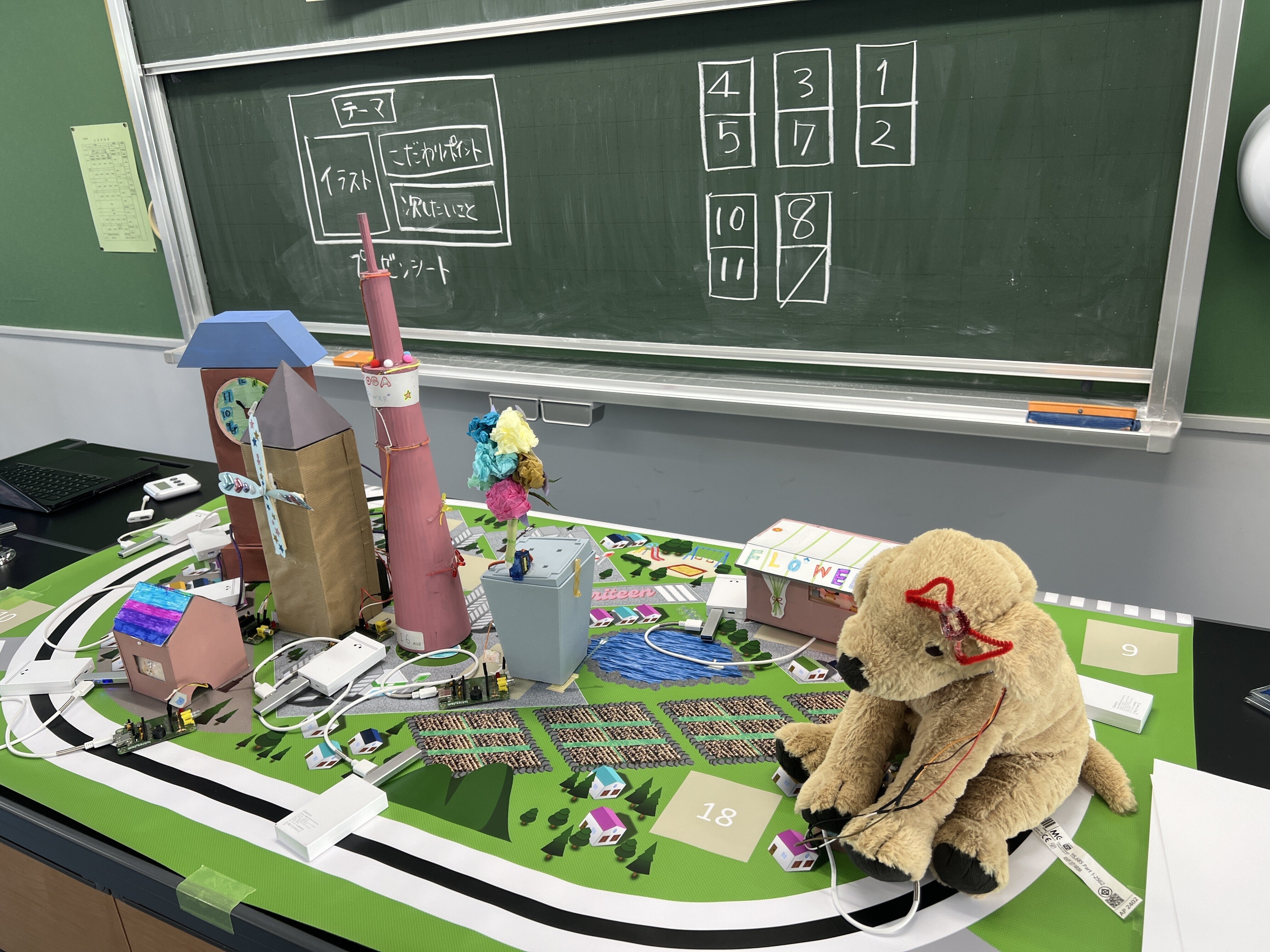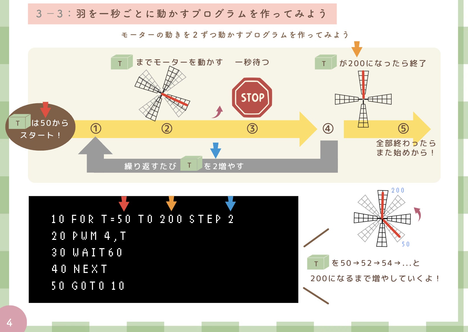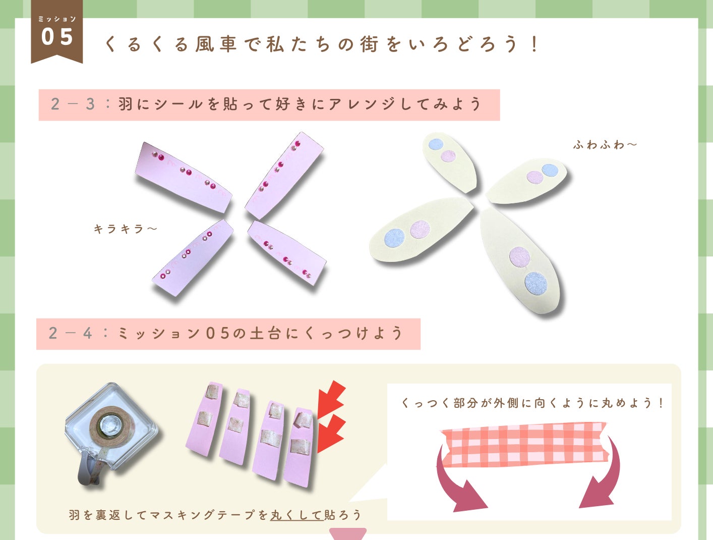 【教材の一部・自分の手で風車をデザインし、プログラミングをしてまちの中で動かします!】