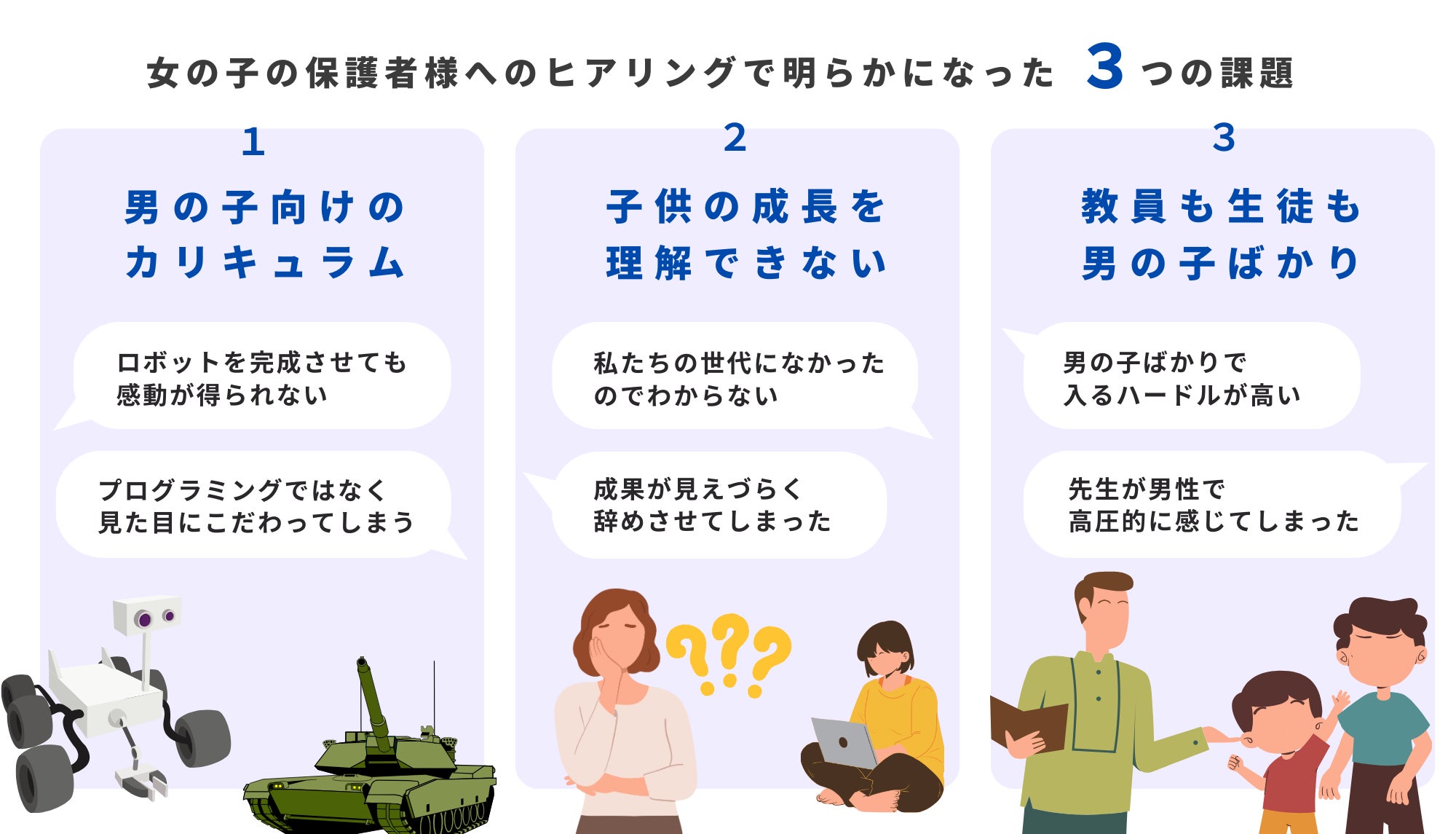 なぜ「griteen」は女の子特化のプログラミングスクールとして運営しているのか、それは、女の子の保護者様30名に行ったヒアリングで明らかになった、現状のプログラミングスクールにある3つの課題を解決したいという思いがあります。