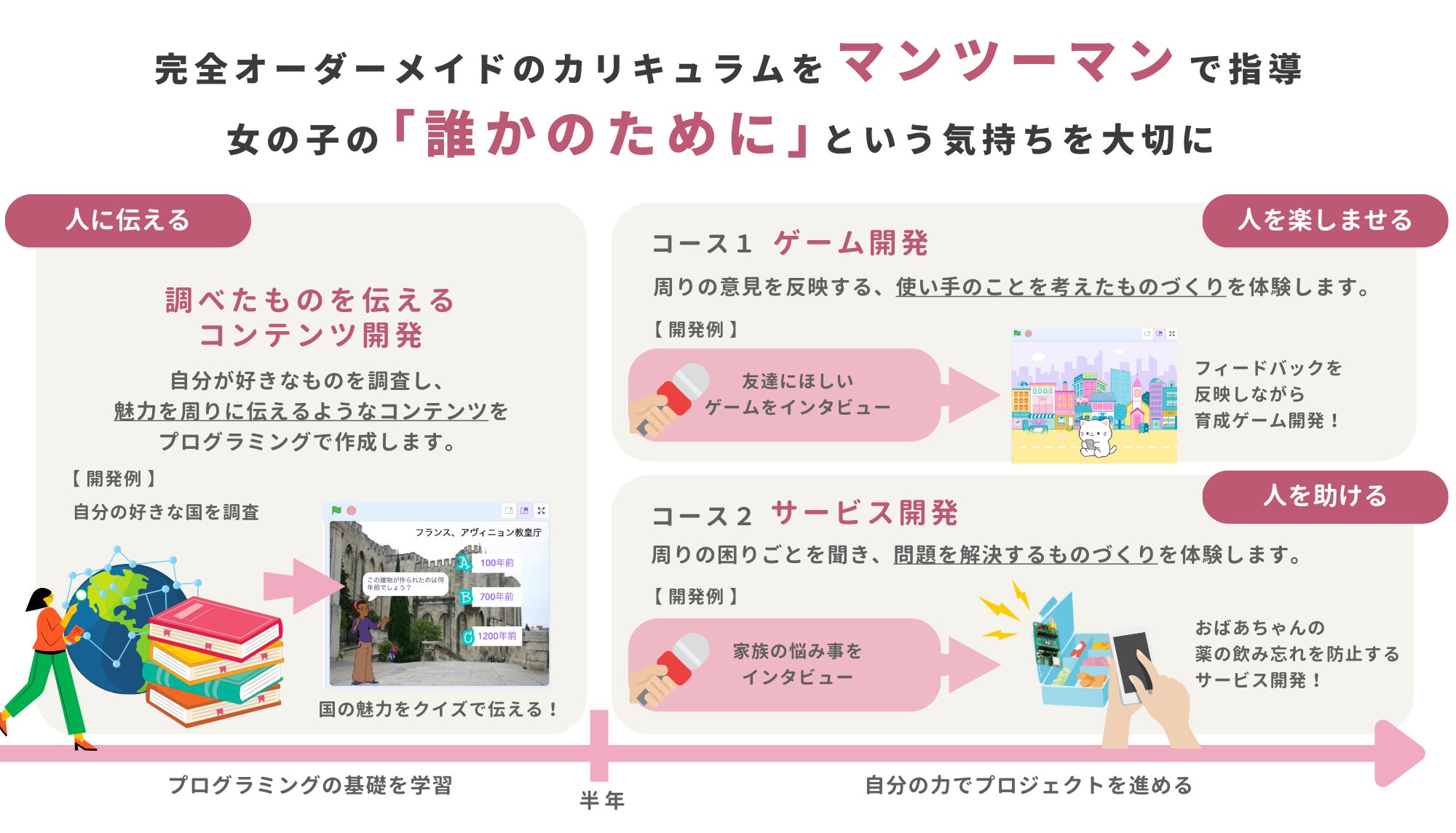 またプログラミング教室だけでなく、ショッピングモールや学校などで実施される無料のプログラミング体験イベント・出張授業を通じて、多くの女の子とその保護者様にプログラミングを知るきっかけと学習機会を提供しています。