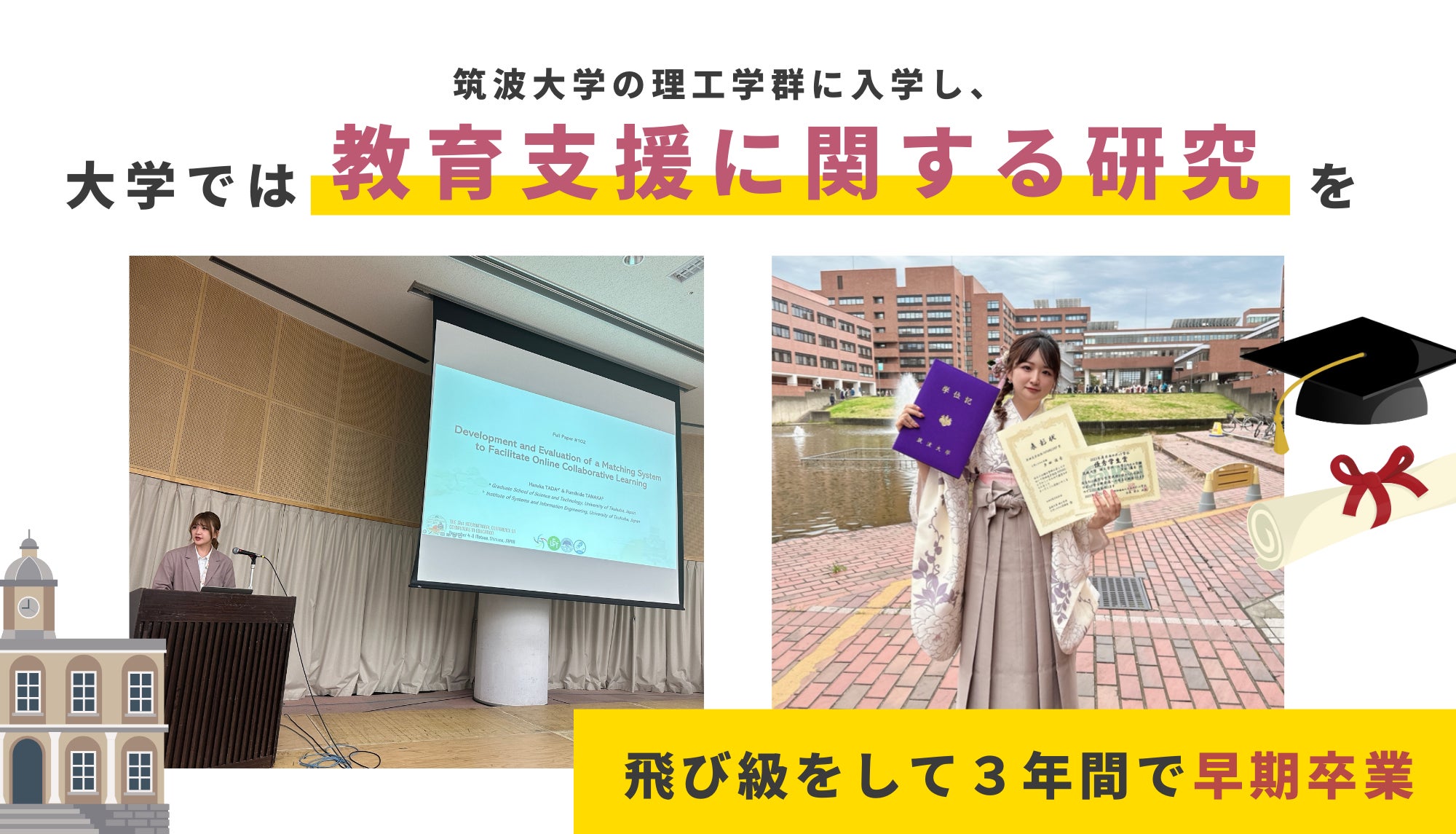 このような経験から、プログラミング教育をもっと多くの人が受けられる環境を作りたいと考え、大学では情報学の視点から教育支援をする研究を行いました。プログラミング教育で身につけたやり抜く力「grit」を活かし、大学を3年間で早期卒業しました。