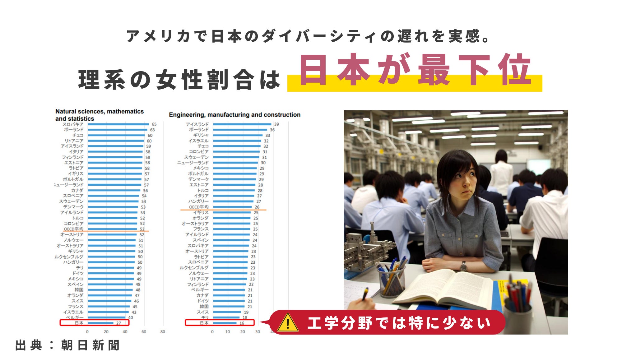 例えば、日本の理系の女性人材の少なさは世界トップレベルで、特に工学分野では16%と極めて少ないです。このような状況のままでは、理工分野で活躍できる日本人女性の数は限られてしまい、ダイバーシティ推進を実現することはできません。
