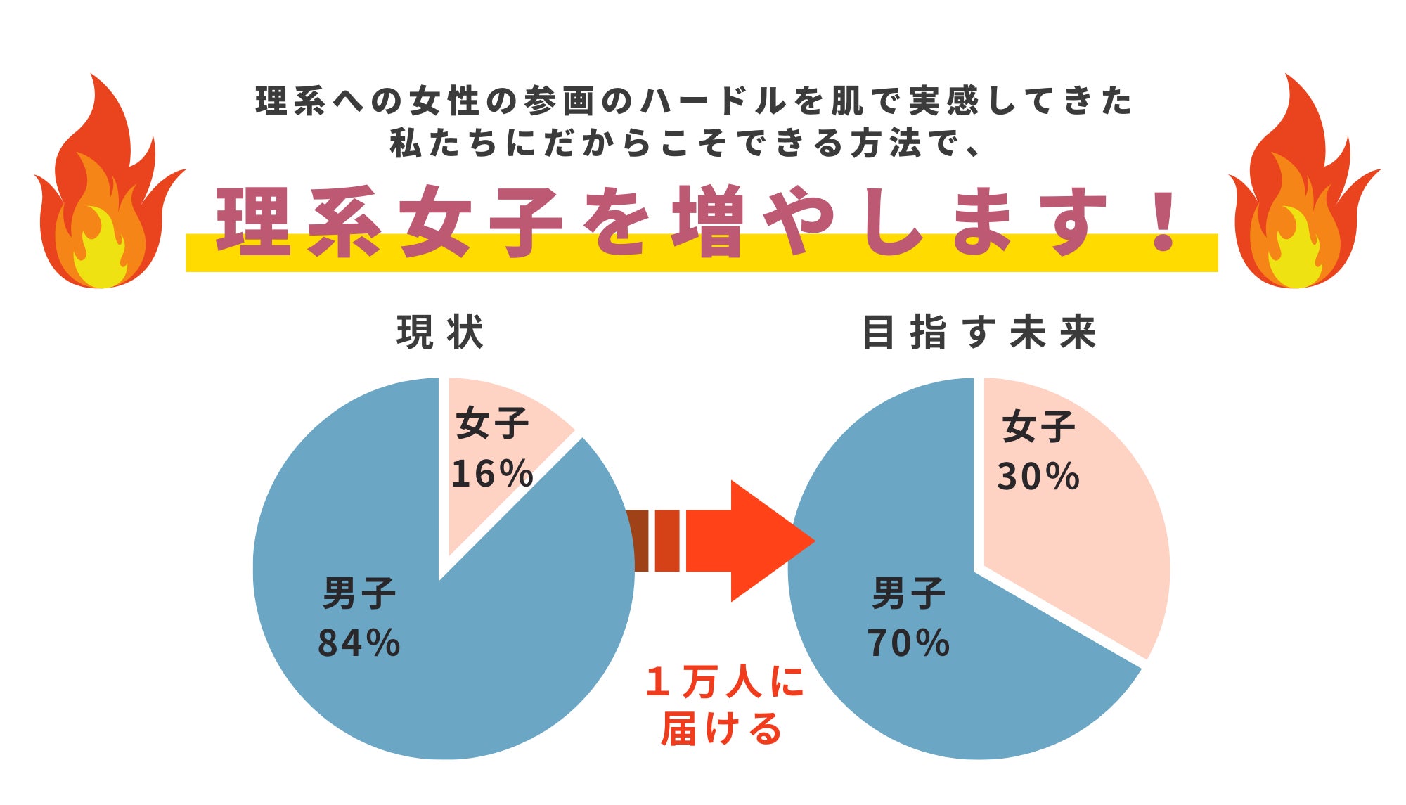 我々の目標は、日本の工学分野の女性割合を16%から30%に引き上げることです。そのために、1万人の女の子とその母親にプログラミング教育を届けます。理系への女性の参画のハードルを肌で実感してきた代表にだからこそできる方法で、日本から持続可能な社会を実現してみせます!!