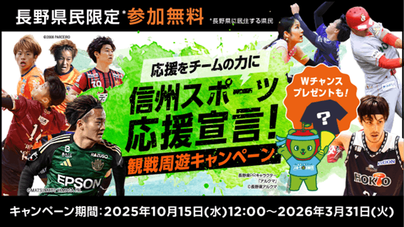 2025/10/29 21:26【信州スポーツ応援宣言!観戦周遊キャンペーン】こんにちは!アルクマです今日は県内のプロスポーツチームの試合をお得に観戦できるキャンペーンのご紹介!10月15日から、「レジャパス」という定額制サービスで県内プロスポーツチームの観戦チケットがお得に購入できるようになりました!しかも、先着500人には3試合分のチケット購入に相当するコインのプレゼントがあるみたい。つまり、お一人で3試合もしくは3人で1試合が無料で観戦できちゃうということです♪どのチームの試合を応援しに行こうか迷っちゃうね。さらに!来年の3月2日までにレジャパスを使って3チームの試合を観戦した方には、オリジナルグッズがもらえるチャンスも!景品の中にはアルスポのロゴが入ったマグボトルやトートバックがあります。ぜひゲットしてね♪↓詳しくはキャンペーンのHPをご覧ください。https://origress.com/lp/nagano-excursionアルスポのみんな、試合会場に応援に行って信州スポーツを盛り上げよう! もっと見る