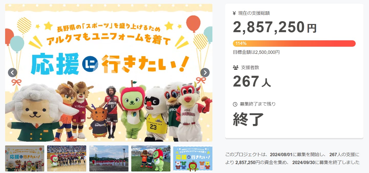 「長野県の『スポーツ』を盛り上げるためアルクマもユニフォームを着て応援に行きたい!」の募集が9/30をもって終了しました。みなさんのご支援、ご協力により本プロジェクトは目標を達成することができました。ありがとうございました!!!