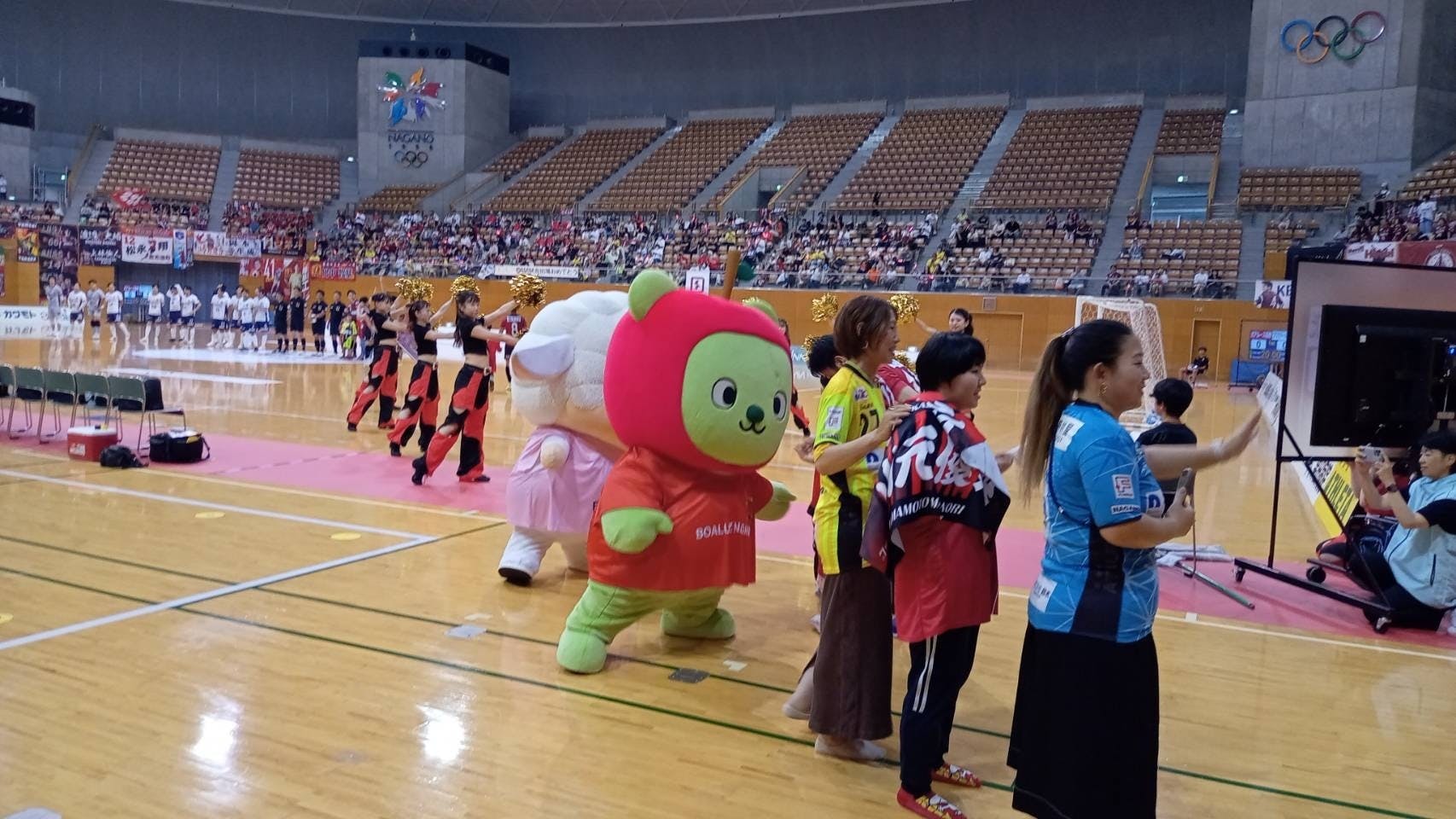 会場に集まったのは、ブレアー(信州ブレイブウォリアーズ)、グロッテ(VC長野トライデンツ)、ルートン(信州ブリリアントアリーズ)と対戦チーム福島ユナイテッドFCから赤兵衛!!ガンズくん(松本山雅FC)と一緒に応援しました♪♪