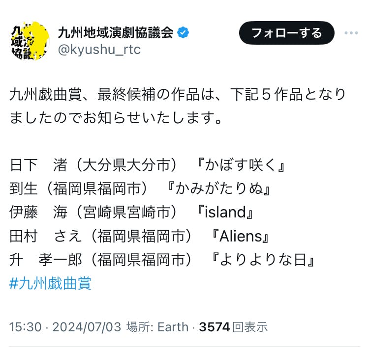 2024/07/10 20:00この度、当劇団の代表到生の作品「かみがたりぬ」が九州戯曲賞の最終候補に選ばれました。最終審査を経て大賞受賞となり、東京公演に勢いをつける事ができるのか…!!こちらも是非応援をよろしくお願いします!! もっと見る