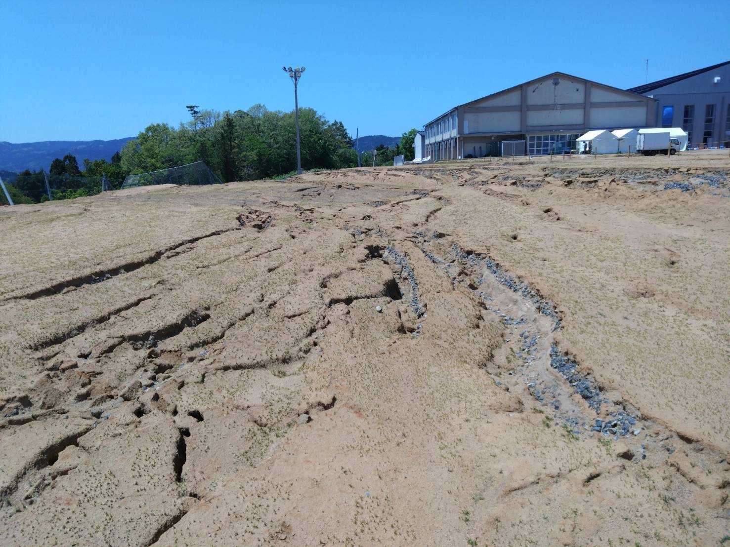 能登半島地震により、輪島リングスの活動拠点である輪島中学校グラウンド、屋内施設は大きな被害を受けました(写真1)。輪島リングスのメンバーは県内外に離ればなれになり、活動できない日々が続きました。そんな輪島リングスの子ども達に活動場所を提供し、温かく迎えて下さったのは伏見台リトルマウスの子ども達・保護者の皆さんでした(写真2)。また中能登織姫SBCの活動拠点であるグラウンドも大きな被害を受け、使用困難となり十分な活動ができず、限られた環境下での活動が続いています(写真3)。
