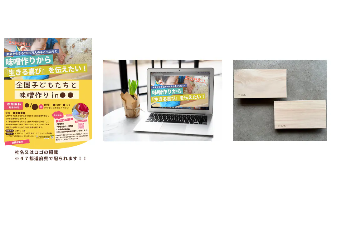 【スポンサー】お礼のメール・味噌作りの様子をご報告・全国味噌行脚のチラシ&HPにスポンサーとして掲載・子どもたちに鳥取県智頭町の木で作ったオリジナルまな板プレゼント7枚 ¥150,000