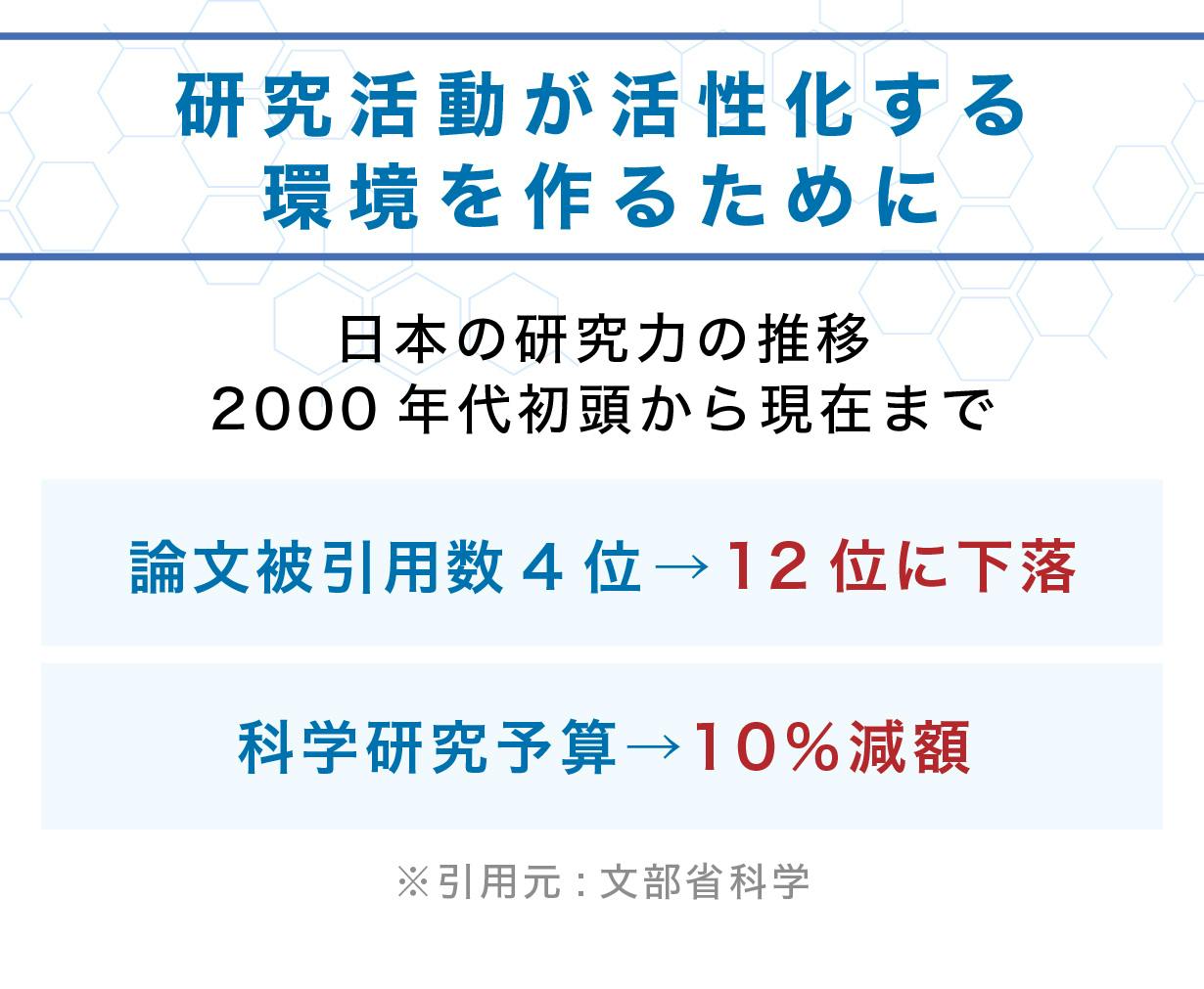 しかし、他国が科学研究予算を増額する中、日本はこの20年で10%減額しているのが現状です。