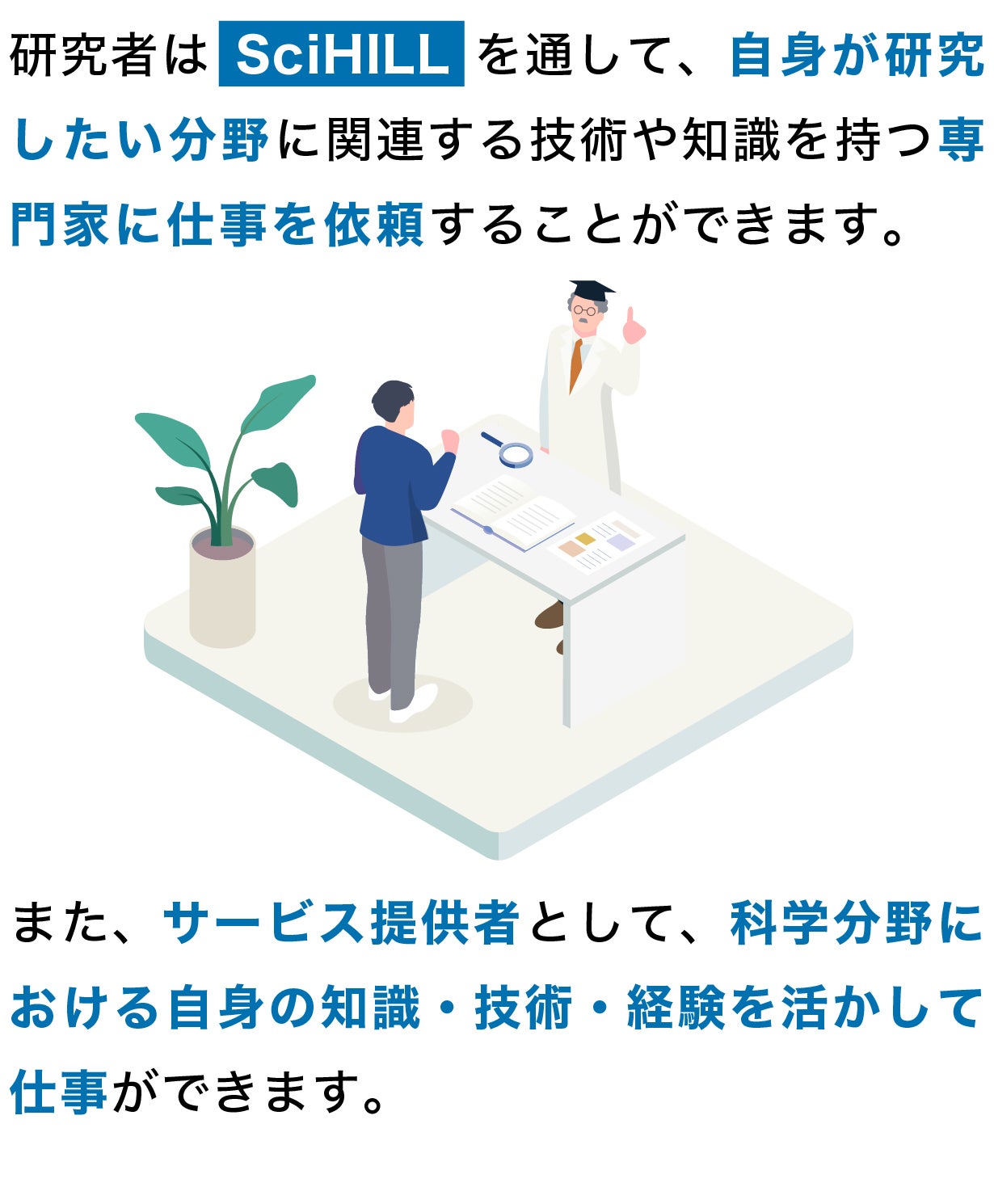 SciHILL は、科学分野で活躍する研究者同士および研究者と技術者を結ぶマッチングサービスです。