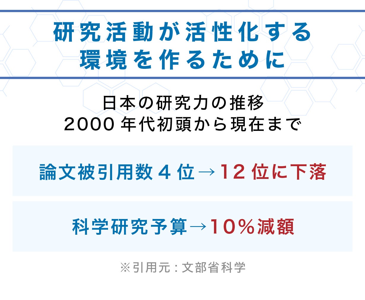しかし、他国が科学研究予算を増額する中、日本はこの20年で10%減額しているのが現状です。