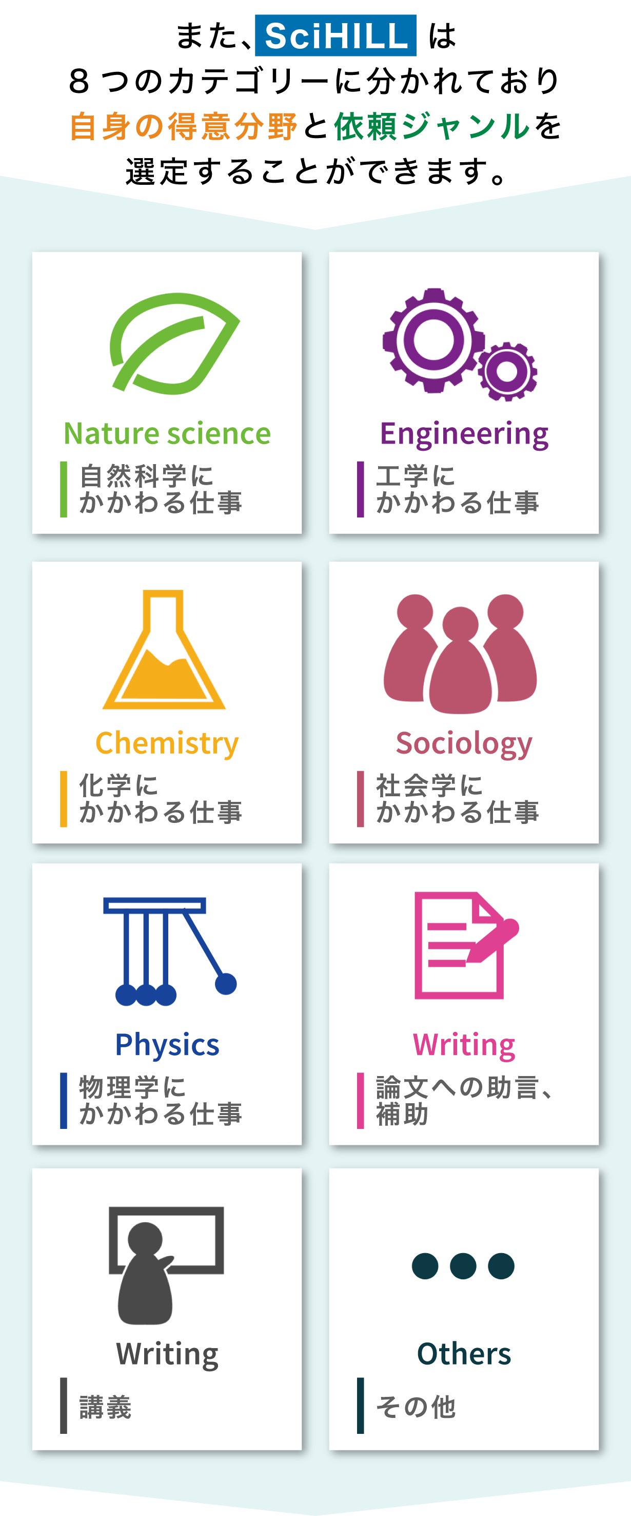 この度、日本の科学研究力向上に向けた研究の活性化のために、科学研究特化のスキルマーケットSciHILLを立ち上げました。