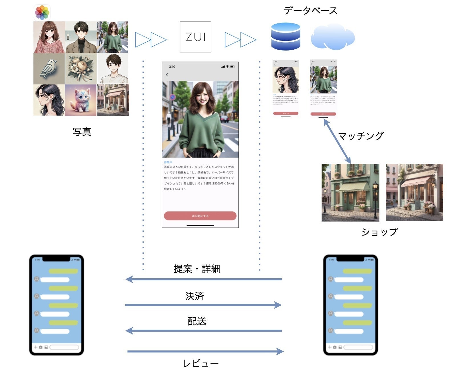 まず初めに本サービスの全体像を説明します。以下の図をご覧ください。ユーザーは自分の写真アプリやカメラ撮影した写真をZUIにアップロードします。その際に欲しい商品についての詳細な説明を記入し、データベースの方へ登録します。ショップ側はユーザーが投稿したオーダーの一覧を閲覧することができ、自身のショップが作成できる、もしくは取り扱いをしているような商品がございましたら、そのユーザーに対してアプローチをかけることができます。一般的なフリマはショップがデータベースに登録し、ユーザーが一覧を閲覧するので、全く逆向きのシステムであります。そして、ショップはユーザーとのトーク画面に遷移し、あらためて作成する商品の詳細の確認、値段の確認を行ったのちに決済をします。ユーザーは決済前までは、ショップに正式に依頼するかを決めることができ、あまりショップとのマッチが良くない場合は再募集をかけることができます。決済が完了後はショップは商品の作成や取り寄せを行い、配送手続きまで完了させます。決済の際に手数料10%をプラットフォームはいただき、そちらを本アプリでの収入源にしております。