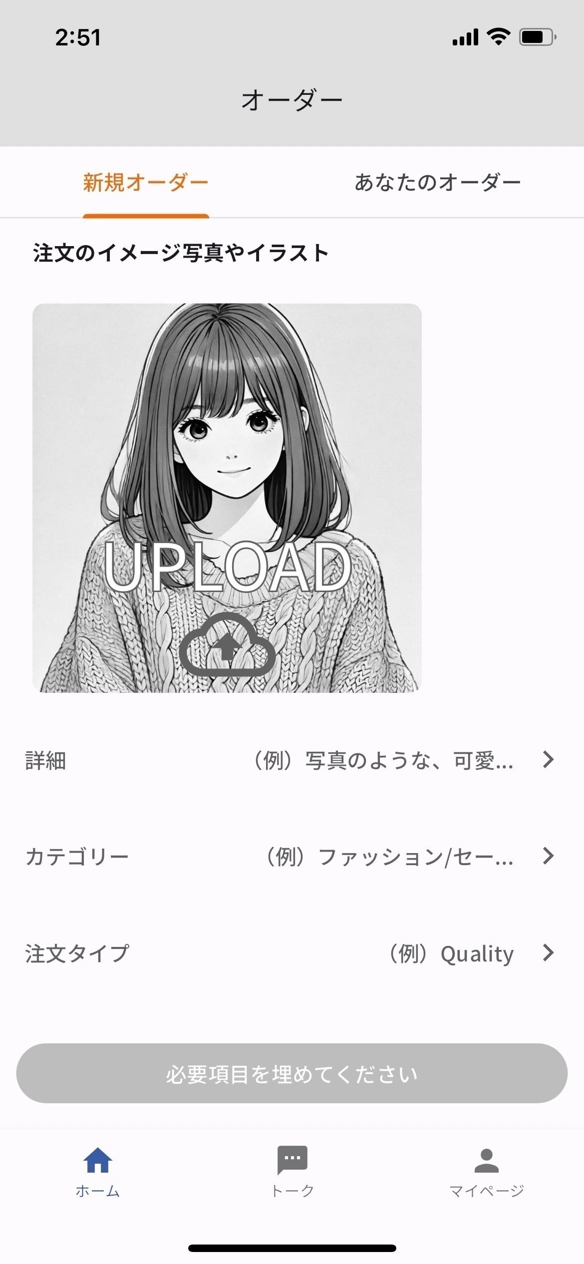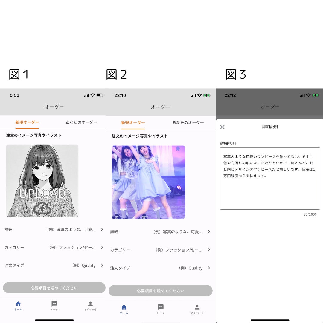 1. 顧客が自分が欲しいと思ったものが写った写真をアップロードし注文を作成