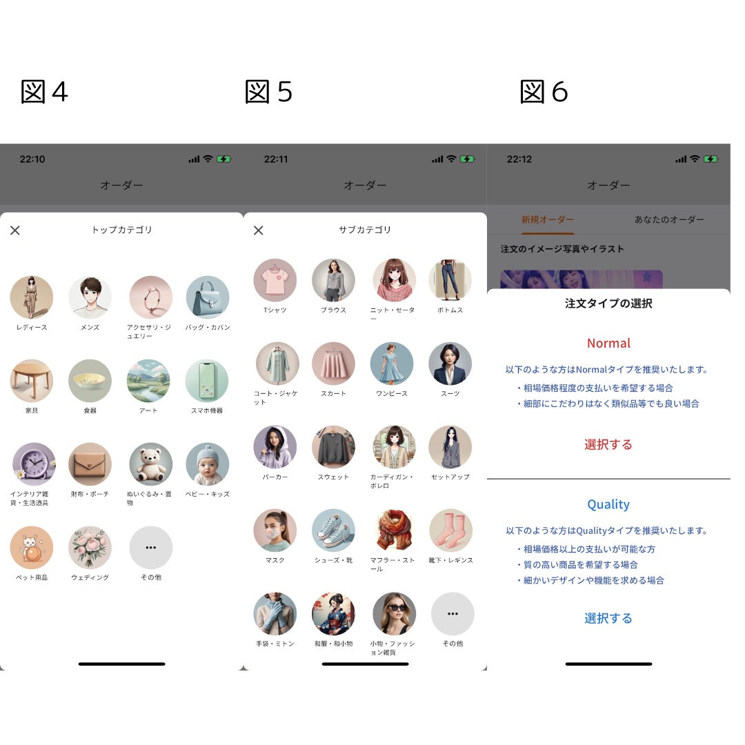 図2では、自分が欲しい商品の写真がわかりやすく写っているような写真をアップロードしたときの画面になります。そして図3が具体的な商品に対するこだわりや支払い想定の金額などの詳細を記入するモーダルになります。この場合では水色のワンピースがほしいということと、1万円程度の支払いを想定していて、細部にまでこだわりたいということが伝わると思います。その後は図4、5のように商品のカテゴリを選択していただきます。こちらはショップ側が注文を探しやすくするために顧客が設定します。近いものがなければその他が選ばれる想定になります。図6はこの注文に対する金銭的、質的なこだわりを選択していただきます。特に強いこだわりがない場合はNormalを細部までこだわりたい場合はQualityを選択します。必要となる経費もQualityの方がかかる見込みで注文を促しています。