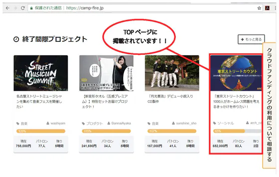 とうとう、campfireの『終了間際のプロジェクト』TOPページに掲載されるようになりました!(現在も表示されているので、よかったらみてみてください!)