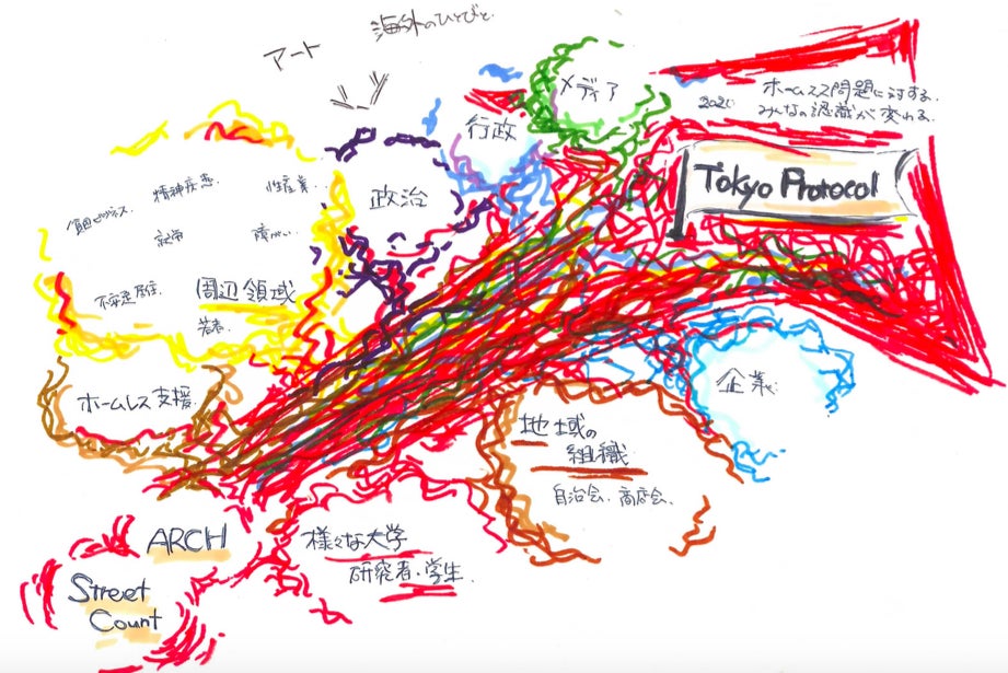 2020東京オリンピック・パラリンピックまで、あと2年となりました。私たちは、華やかな大規模イベントの影で社会的・経済的に弱い立場にある人々を周縁に追いやるのではなく、多様な人々が共に暮らし支え合う営みをレガシーと遺したいと考えます。具体的には、シドニーのホームレス・プロトコル(議定書)(※)を参考に、「東京版ホームレス・プロトコル」をつくりたいと考えます。ホームレス状態にあっても市民と同じ権利を有し差別されないことを取り決めたシドニーのプロトコルのように、東京という都市が、ホームレス問題に本気で取り組み、多様な人々のホームであり得る街になる、そういう宣言をつくりたいのです。この絵のイメージのように、プロトコルをひとつの旗として、ストリートカウントなどを介してつながったり関わった様々な立場の人々—を巻き込みながら議論や参加の渦を大きくし、東京をより大きく変化させたいと思っています。…これができたとしても、思い描く都市を実現するためにはとても小さなことです。でも、「ゼロ」ではないなら、もっともっと広げていけると思います。 みなさまぜひ一緒に歩んでください。