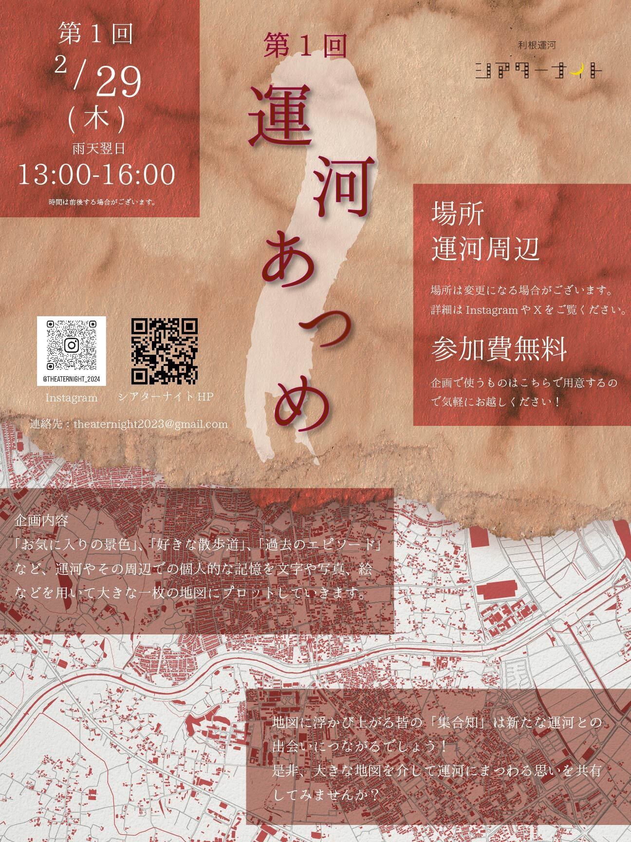 今年度は利根運河シアターナイト2024への足がかりとして9m×4mの巨大な地図に運河での思い出や歴史を書き込んでもらう「運河あつめ」と言う参加型企画から活動をはじめました。集まった記憶や話しはリサーチ活動としてはあまりに雑多で多様なもので、何かを結論付けることはできませんでした。その一方で、大事にされている運河というものを強く感じる機会となりました。ここで得た経験を大事にしながら、利根運河シアターナイト2024も誰かの大切な思い出の1つとして加われれるよう創り上げたいと考えています。