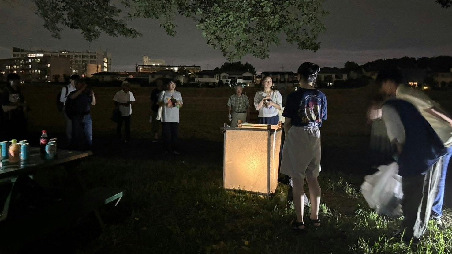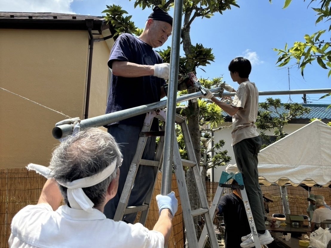 清辺北岸は私たちが普段利根運河シアターナイトの会場として利用している運河水辺公園沿いの地域です。普段から私たちの活動を温かい目で見守って下さり、応援して頂いている方々の助けになれば嬉しいということで参加させて頂きました。こちらも、準備から参加させて頂き、当日は焼きそばを焼くなどの手伝いをしました。普段は何気ない小さな公園に、単管パイプやすだれなどを用いて、涼を取りながら空間を作っていく経験は私たちの活動に通じるところがある様に感じ新鮮でした。