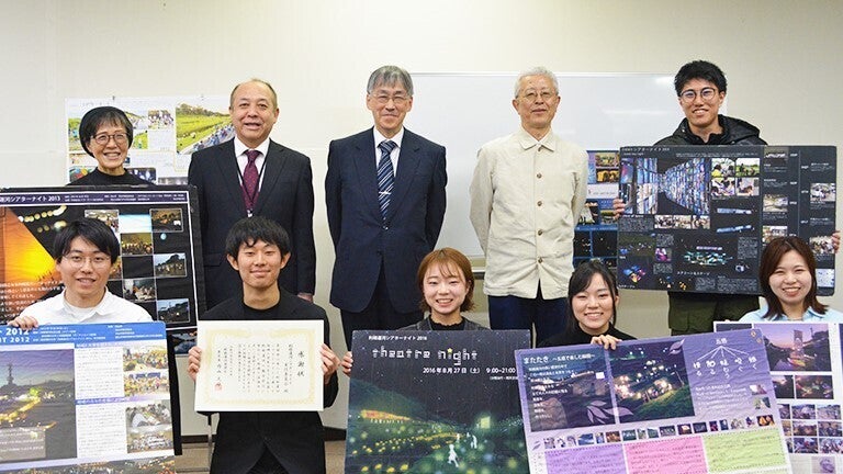 過去のプレゼンボードと共に記念撮影