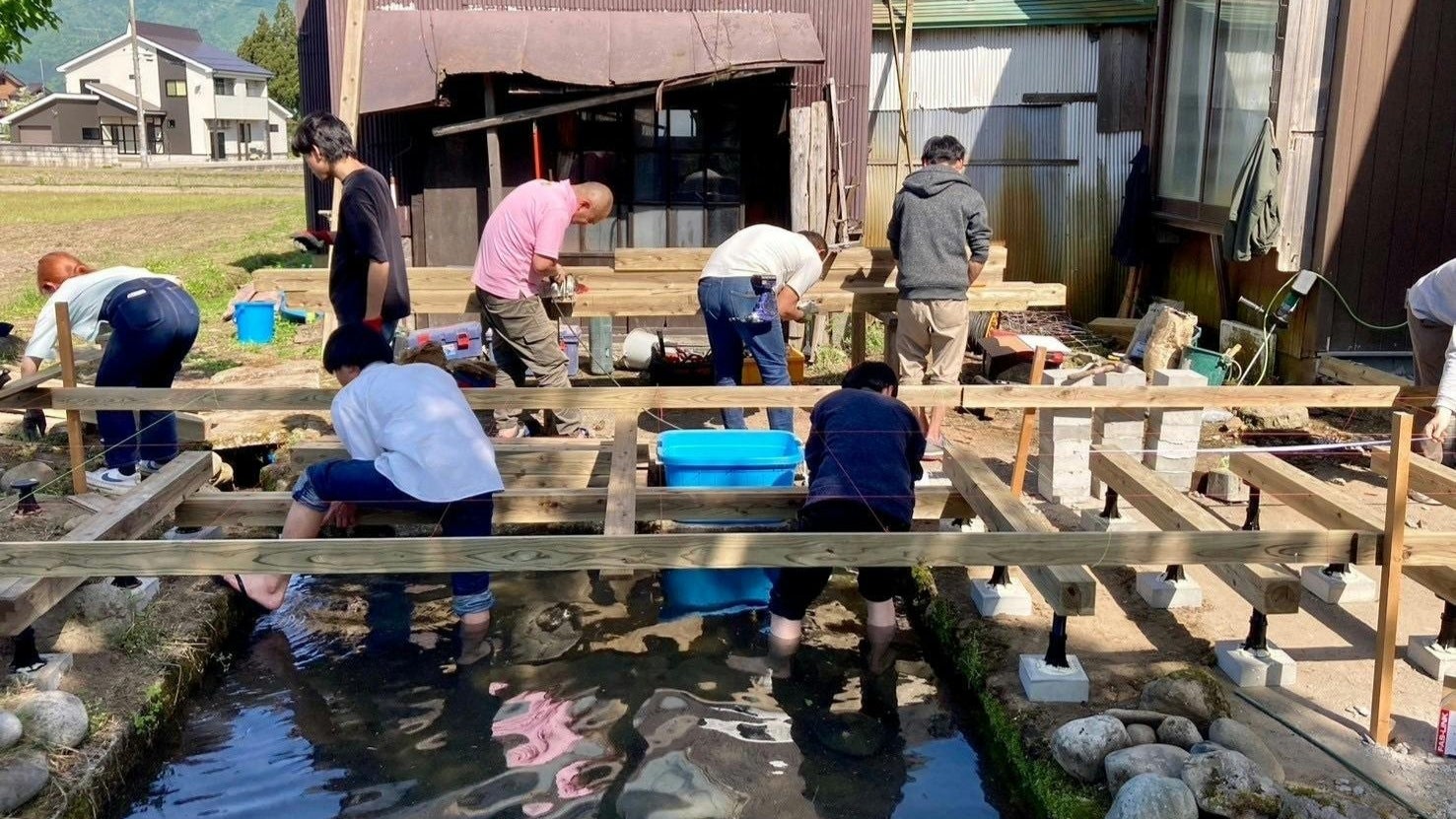 内容としては南魚沼の「和っぱれ」という古民家をリノベーションした宿の裏庭にウッドデッキを作るものです。春頃にシアターナイト実行委員会の有志で集まり模型を用いながら案を練り、実際に事務所の方にプレゼンし施工することになりました。