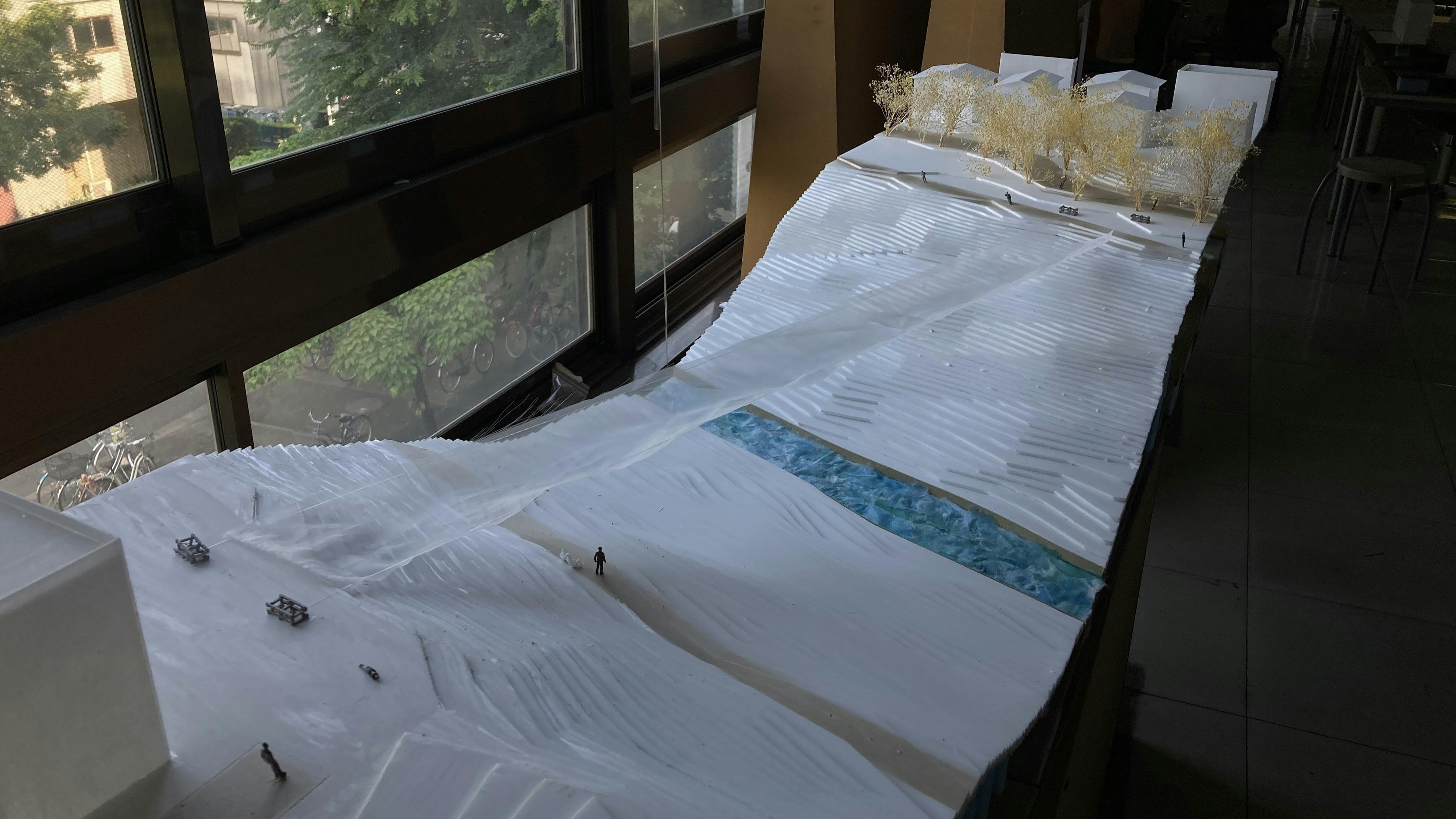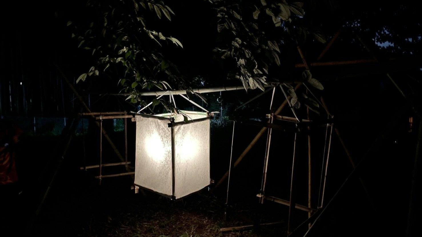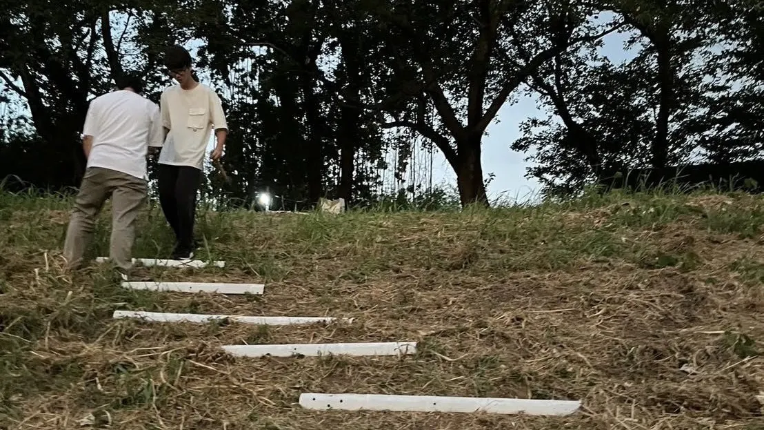 普段人が立ち入らない斜面からみた美しい運河の景色を光る膜と共に来場者と共有したいという思いから、この企画は始まりました。最初は、竹による突起を思いつかず、階段を作ることの難しさに絶望していました。しかし、元登山部のメンバーの思い付きでこの様な案が出てきたことで、一気に視界が開け同じ様な仕組みで階段だけじゃなくて、人の居場所も含めてデザインできる様になりました!しかし現状の予算だと作れる範囲が限られてしまっています…