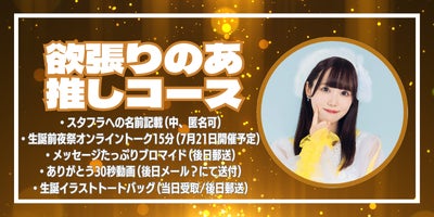 ・スタフラへの名前記載(中、匿名可)・生誕前夜祭オンライントーク15分(7月21日開催予定)・メッセージたっぷりブロマイド(後日郵送)・ありがとう30秒動画(後日メールにて送付)・生誕イラストトートバッグ(当日受取/後日郵送)