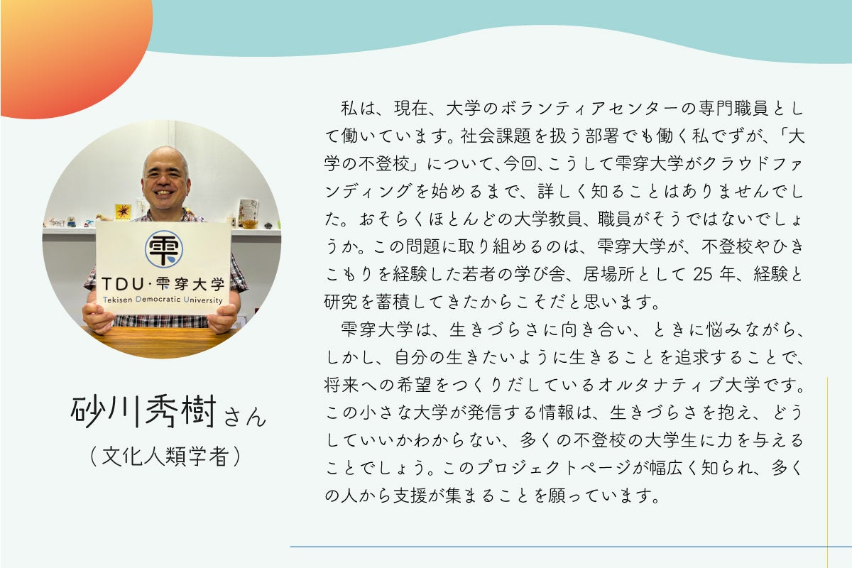 目標を達成しました!ありがとうございます!こんばんは。クラウドファンディングプロジェクトチームです!8月19日から開始したクラウドファンディング「大学の「不登校」を知っていますか?苦しむ12万人に選択肢を届けたい」は、先ほど終了し、無事目標を達成することができました!総支援額は「2,030,000円」、達成率は101%となりました。ご支援くださった皆さま、さらに最後まで応援メッセージやシェア等様々な方法で支えてくださった皆さま、本当にありがとうございます!開始した当初は、この「大学の不登校」はあまり知られていない問題だったこともあり、目標達成できるのか、不安な気持ちもありました。しかし、皆様のご協力もあり、少しずついろんな方に知っていただくことができて、予想以上にたくさんの方からの反響をいただきました。「今まで知らなかった」という方からは共感と大変暖かい応援を、あるいはご自身も「大学の不登校」を経験し苦労したという方からは貴重なご支援と応援の言葉をいただきました。様々な形でいただいた皆さまからの想いに、胸がいっぱいです。この皆さまからの貴重なご支援と想いを胸に、一層の決意をもって、今も大学を不登校して「生きづらさ」に苦しむ人々に選択肢を届け、さらには不登校・ひきこもり・教育の在り方についての議論を深めるため、アクションを実施していきます!これからも私たち雫穿大学の試みにご関心を寄せていただければ幸いです。改めて、皆様のご支援とご協力に、心からのお礼を申し上げます。本当にありがとうございました!