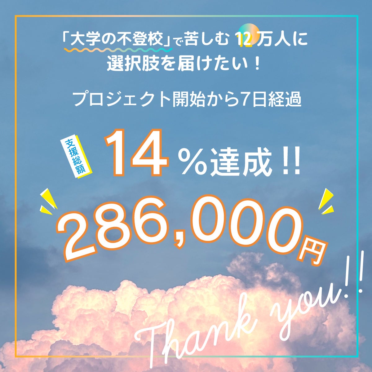 先週月曜に開始した私たちのクラウドファンディング『大学の「不登校」を知っていますか?苦しむ12万人に選択肢を届けたい』は、開始から7日が経過しました。皆様のご支援のおかげで、すでに目標の14%を突破しました!現在支援総額:286,000円。