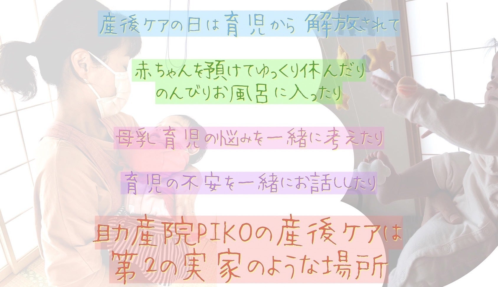 産後ケアは、ママたちが健康で幸せな育児生活を送るための基盤を作る重要な時間だと考えます。助産院PIKOでは、この大切な期間をしっかりとサポートし、ママがリラックスして過ごせる温かい空間を提供しています。