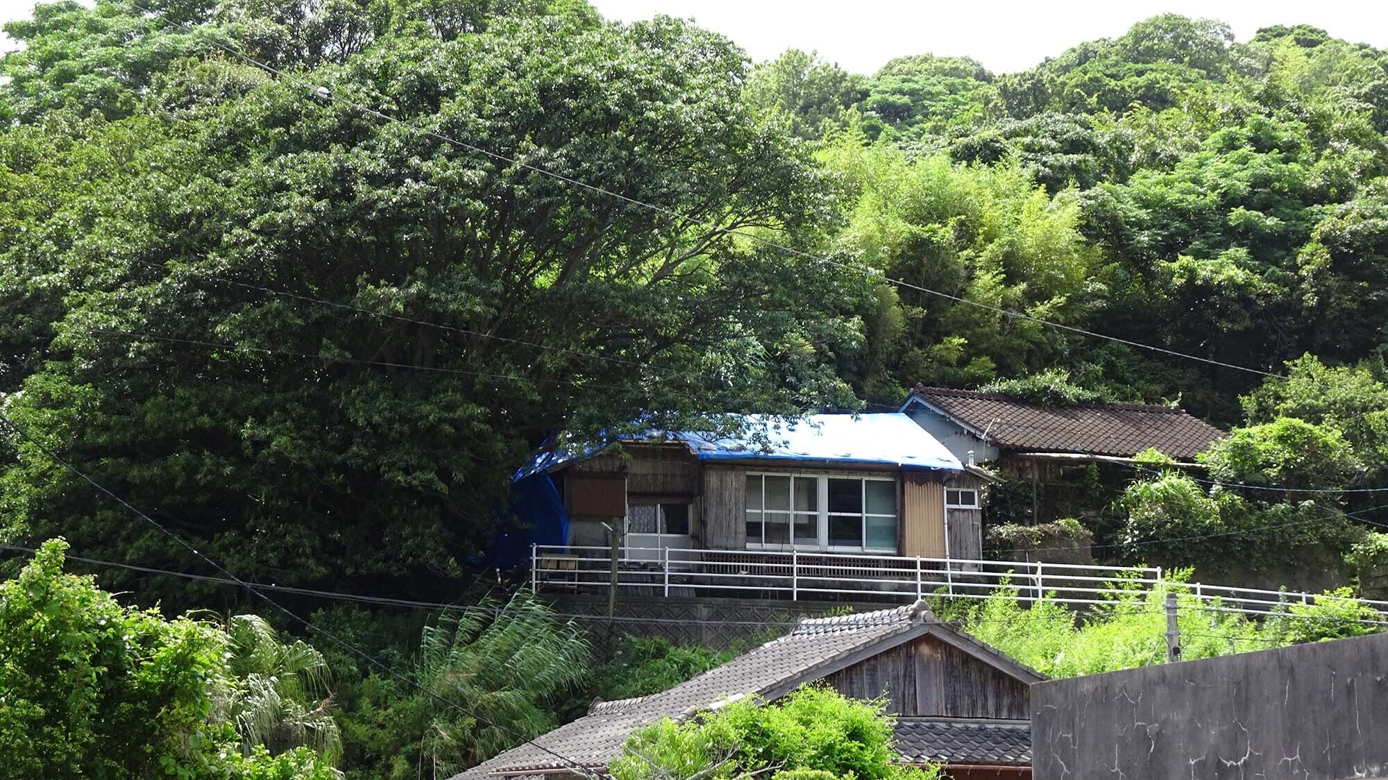 ブルーシートのかかった古民家