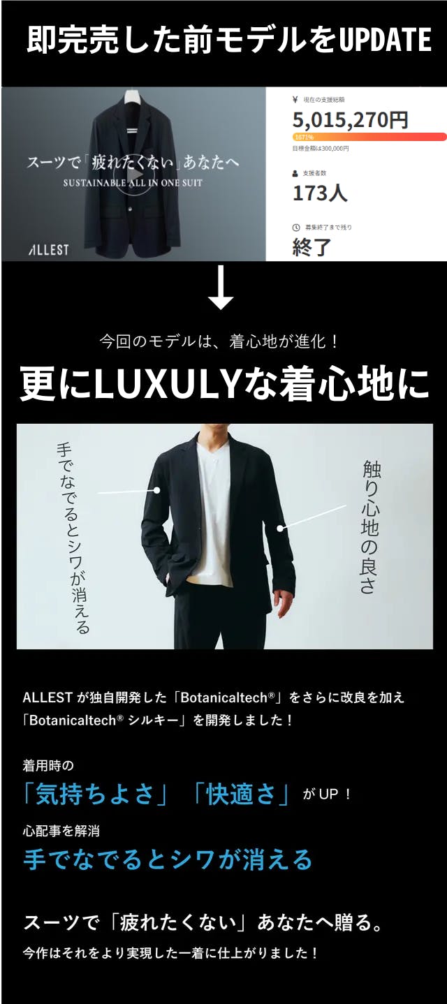 私もそんな風に思いますので、出来る限り、未来永劫続けられるALLESTになって、「あれ、もう一着欲しいな」と数年後に思い返していただけた時には「進化し続ける世界的な永遠の定番」のセットアップスーツでいられたら、そんな思いです。前作も在庫の限り一般販売しておりますので、興味があったらそちらと比べていただけたら、ALLESTの楽しさを更に感じていただけると思っています。(但、クラファン公開時が一番お得にはなっております。)