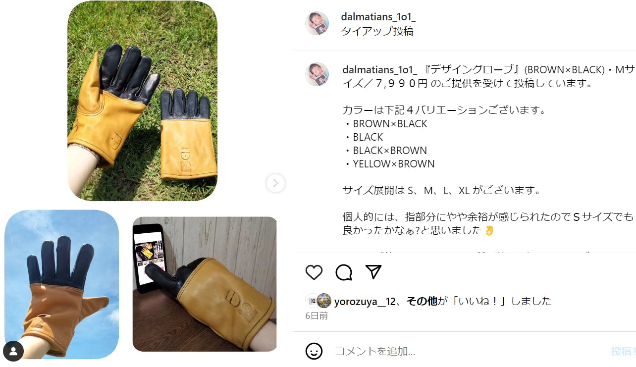 2024/07/20 10:0012ブランドのマルチグローブに興味を持ってくださっている皆様ありがとうございます。世の中にまだ出ていない柔らかくて、デザイン性を大切にした、優しくても強い、そんな革のグローブを目指して作りました。なにより、自分で使ってみたい!そんな大切なグローブです。生まれたてほやほやなので、使用感などを公開ページには詳細に盛り込みましたが、他にももうちょっとお伝えしたいと考えて、多くのInstagramで人気の方々に「12マルチグローブ」使用していて欲しいです!と募集しまして、実際に使ってSNSに公開していただいております。本日は、dalmatians_1o1_さんの投稿をご紹介します。https://www.instagram.com/p/C9GZvQEy62J/?utm_source=ig_web_copy_link&igsh=MzRlODBiNWFlZA==引き続きどうぞよろしくお願い申しあげます。12 もっと見る