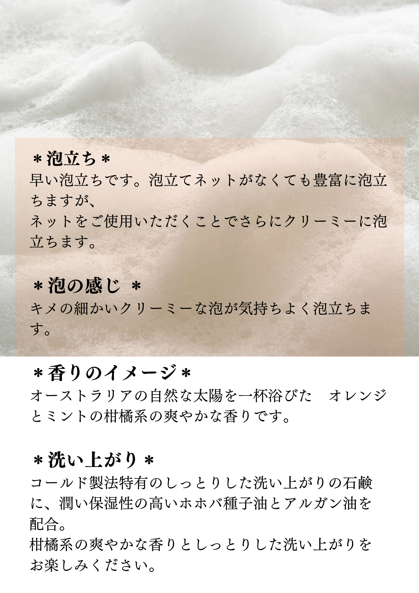 合成剤等フリーなので泡立ちは控えめですが洗浄力には問題ありません。柔らかめの石鹸となっているので少し小さめの50gの大きさになっています。