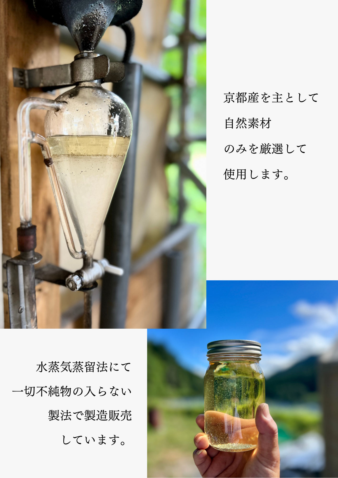 福知山市にて京都産の素材を基本として様々な精油を水蒸気蒸留法にて抽出しています。