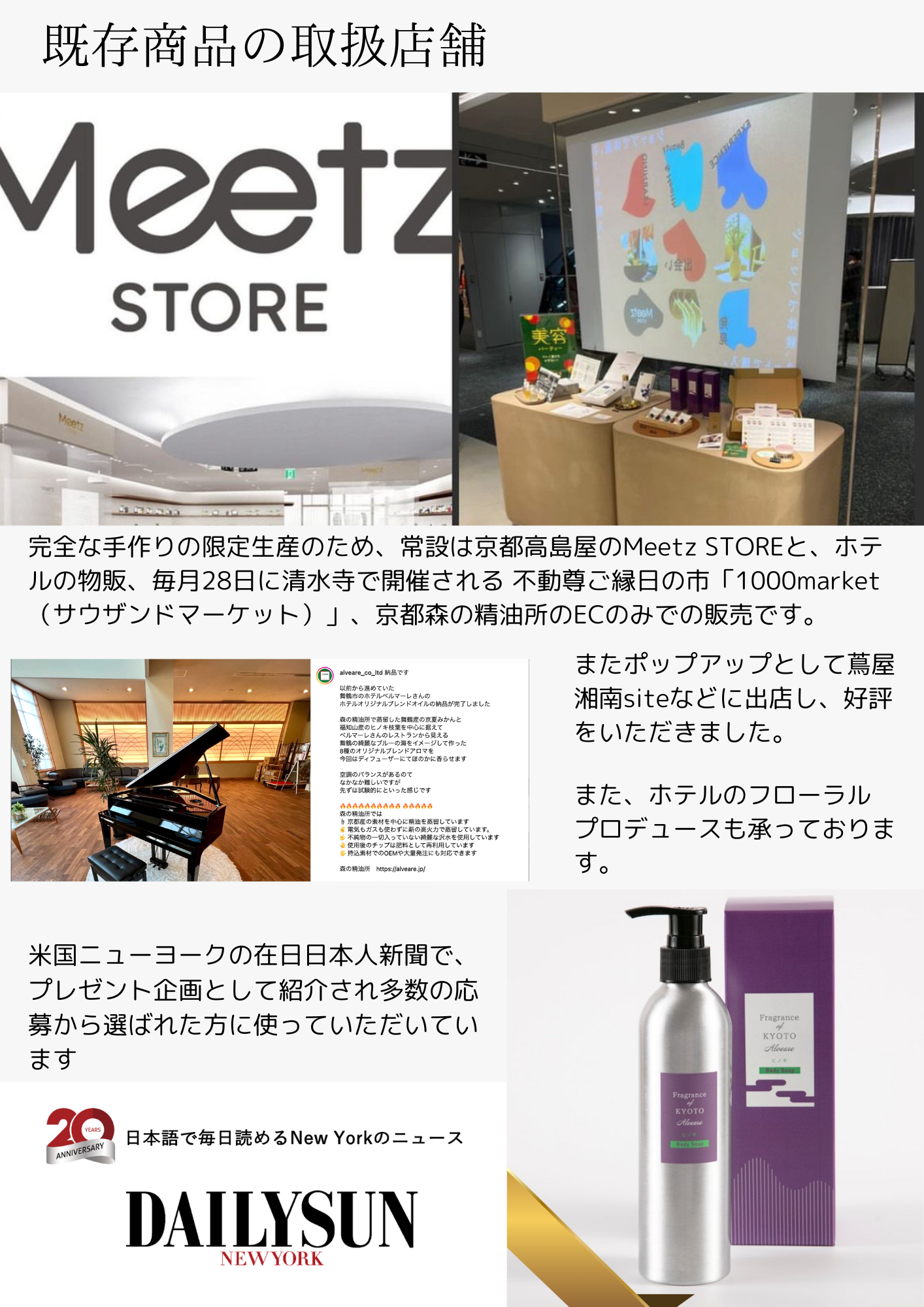 京都・森の精油所で蒸留した「柚子・ヒノキ・クロモジ」3種の京都産精油に加えて、ジャスミンやオレンジ・ラベンダーなど8種の精油をオリジナルブレンド。