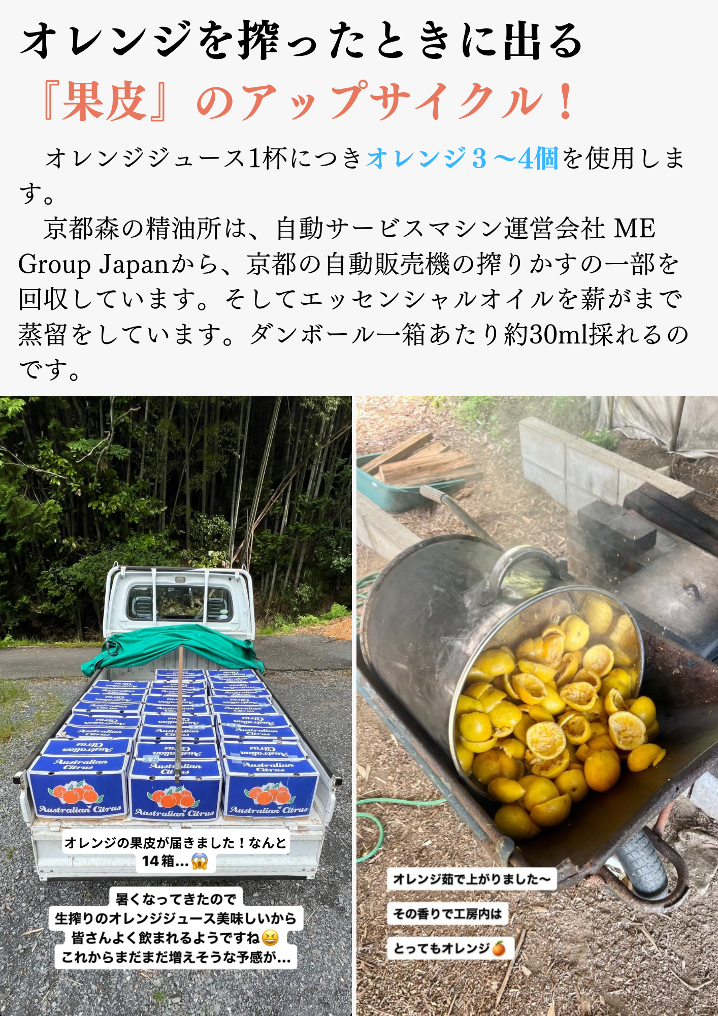 その果皮を森の精油所の薪窯にてエッセンシャルオイルに蒸留し、廃棄物を活用したアップサイクルしリユース製品に加工して無駄の無い社会づくりの一翼を担いたい!そんな思いから始まったプロジェクトです。