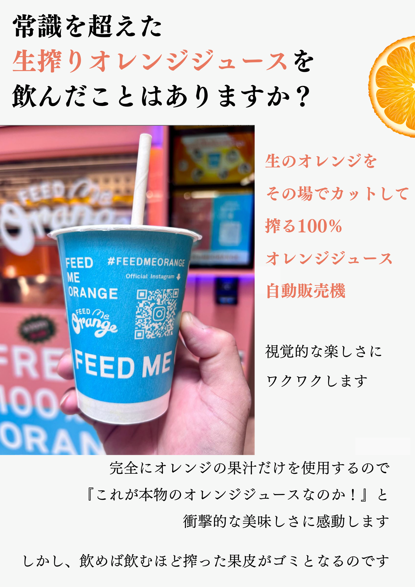 最近マスコミ等で取り上げられている生のオレンジをその場でカットして搾る100%オレンジジュースの自動販売機からは、飲めば飲むほど、消費され廃棄される果皮が発生します。