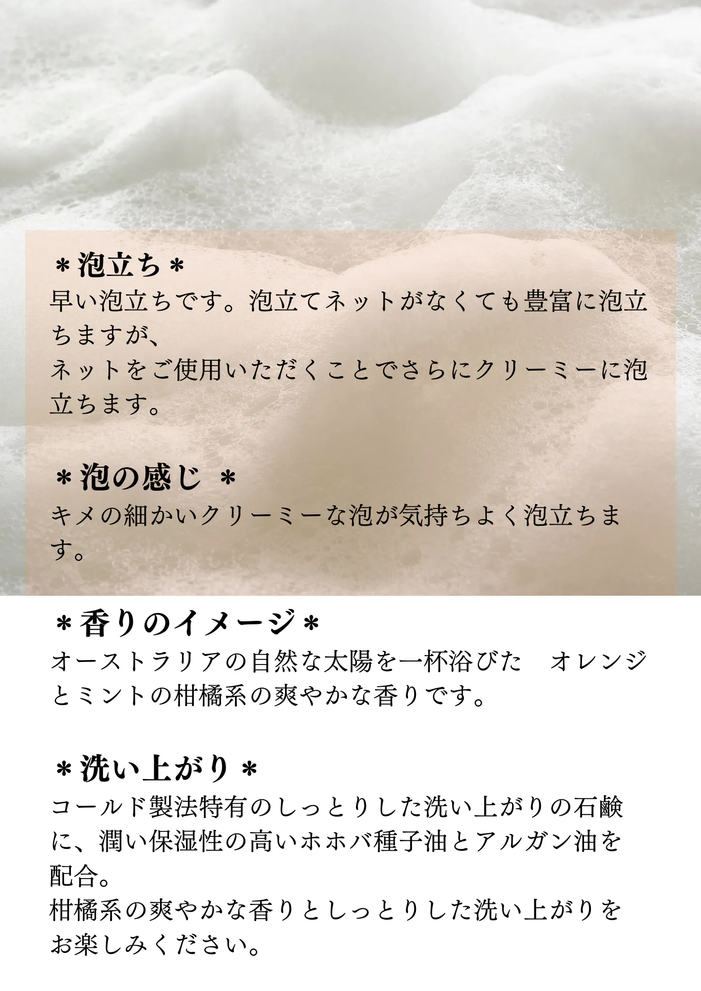 合成剤等フリーなので泡立ちは控えめですが洗浄力には問題ありません。柔らかめの石鹸となっているので少し小さめの50gの大きさになっています。