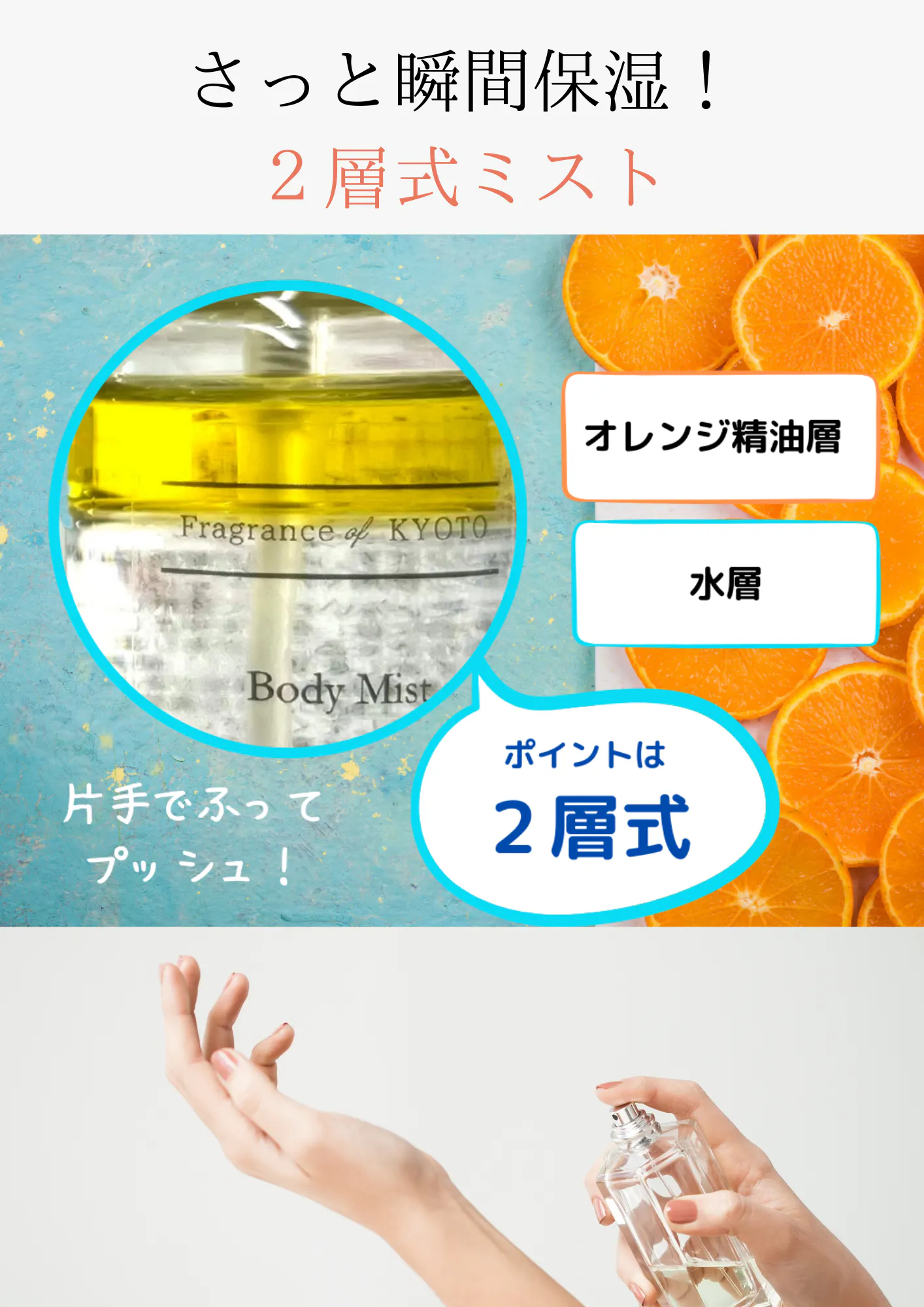 京都・森の精油所で蒸留した「柚子・ヒノキ・クロモジ」3種の京都産精油に加えて、ジャスミンやオレンジ・ラベンダーなど8種の精油をオリジナルブレンド。