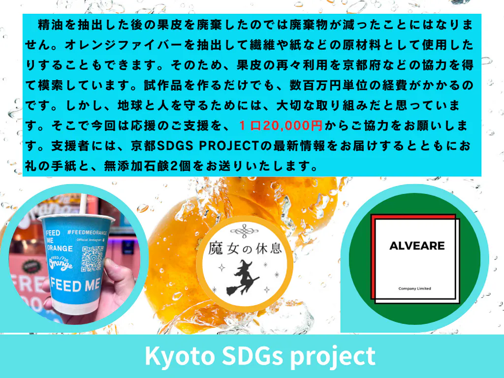 2024/07/29 15:30皆様のご支援をいただき目標金額に届きsuccessすることができました。現在次の目標を目指し気持ち新たに挑戦しております。KYOTO SDGs Projectと名付けて取り組んでいる今回のプロジェクトですが、生搾りオレンジジュース自動販売機から出るオレンジ果皮の廃棄物を廃棄しないで再利用するというプロジェクトの一環として、オレンジ石鹸やボディ&ヘアオイルミストに製品化してクラウドファンディングにて公開しCo2削減や地球温暖化などの環境問題に一人でも多くの人達にご理解していただき協力していただきたいとの思いで取り組んでいます。京都市内に設置されている自動販売機から出るオレンジ果皮だけでも月間2.5トンもの残渣として廃棄されています。それをアップリサイクルして廃棄物ゼロを目標として取り組んでいるのがKYOTO SDGsProjectです。その思いを最大限に届けたいと思っておりますので、SNSなどでこのプロジェクトを拡散していただけると大変うれしく思います。あとワンステップのご協力をよろしくお願い申し上げます。 もっと見る
