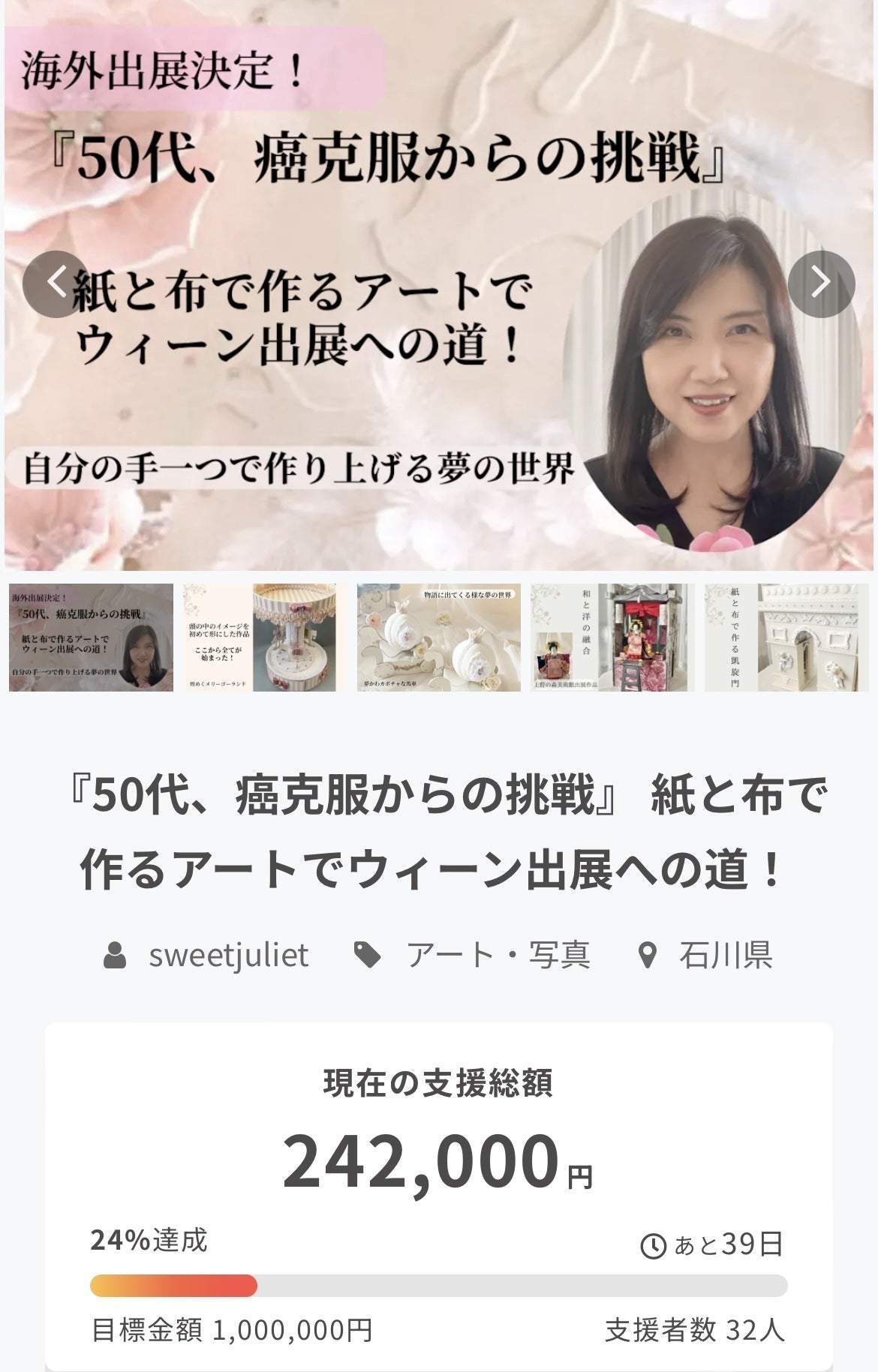 \ご支援下さいました皆様!/大変お待たせして申し訳ありません。やっと私の元に、ウィーンへ出展する作品の画像が届きました!しかし、とても影が多く…実際の作品とは雰囲気も違って、涙…。少し手直しをして、こちらの画像で自身でポストカードを制作する事に致します。リターンに、作品のポストカードをお選び頂きました皆様。もうしばらく、お待ち下さいませ。そして、来月はいよいよウィーンへ行って参ります!皆様のご支援のお陰で、夢の様な体験をさせて頂きます。綺麗な建造物に、素敵な音楽。私の大好きな世界です。たくさん吸収して、一段とパワーアップして帰って参ります。そして今年は、皆様にカルトナージュのレッスンを多くして参る所存です。自分の手一つで作り上げる、ハンドメイドの世界!私の出発は、一つの箱を作る事から始まりました。その一歩が、こんなにも素晴らしい未来を準備してくれる事も知らずに!ただ、ときめいて、自分のやりたい事をやってみたいだけ!多くの女性に伝えたいです。貴女にも、手に入る世界である事を!心ときめく物に囲まれて、過ごす幸せを届けたいSweetjult 沢田幸乃