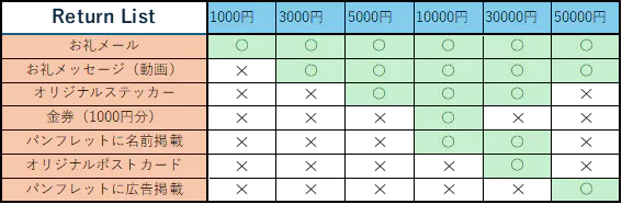 今回私たちが用意したリターンは以下の通りです。