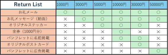 今回私たちが用意したリターンは以下の通りです。