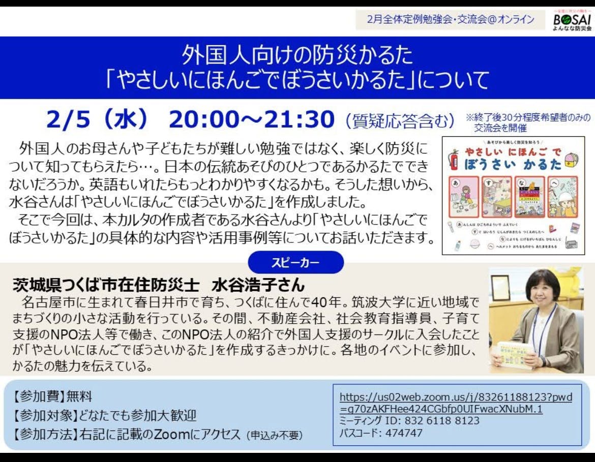 2025/02/08 10:07皆様 おはようございます。まだまだ寒い日が続いていますね。さて2月5日水曜日、全国自治体で防災担当の公務員の方々、防災活動されている方々のネットワーク、よんなな防災会で「やさしいにほんごでぼうさいかるた」のお話をさせていただきました。1時間程度でしたが、かるたの特徴や作成の経緯、クラファンについてもお話できたのかなと思います。このネットワークで県外の方が関心を持っていただけたらいいなと思います。それから昨日茨城新聞で新聞記事感想文コンクールの結果が載っていたのですが、私が以前思った新聞記事を題材に防災かるたの感想文を変えてくださった。鉾田第一高等学校の生徒さんが、文部科学大臣賞を受賞されたそうでその記事が載ってました。私は鉾田には行ったことがないのですが、遠いところの方がそのようにカルタのことを新聞記事で読み、そして私の思いを受け取ってくださったこと、本当にに嬉しいです。これからもいろいろなところでかるたを発信し知っていただき、遊んでいただけるよう頑張りたいと思います。私の力はほんの小さな小さな力ですが、皆様のお心添えやご支援のおかげで今に至っております。本当にありがとうございます。活動するたび、お話をするたび、その感謝の気持ちを心の支えにしながら頑張っています。本当にありがとうございます。これからもがんばりますので、もし自分の地域でかるたをやってほしい、説明が聞きたい、そういう機会がございましたら、ぜひお気軽にお問い合わせください。ありがとうございます。 もっと見る